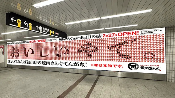焼肉食べ放題専門店「焼肉きんぐ」を運営する株式会社物語コーポレーションは、「焼肉きんぐ namBaHIPS店」のオープンを記念し、Osaka Metroなんば駅にピールオフ広告を掲出しました。