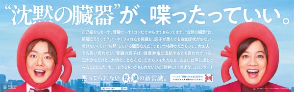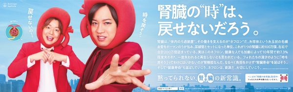 慢性腎臓病の理解促進という堅くなりやすいテーマを身近に届けるため、起用されたのはお笑いコンビ・ぺこぱの2人。腎臓を模した赤い被り物で並び、沈黙の臓器が「もし喋ることができたら?」という設定のもと、腎臓が発したい声やSOSをユーモラスに代弁します。