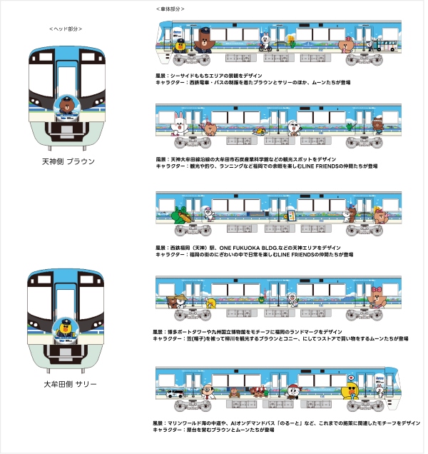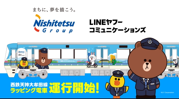ラッピング電車には、LINE FRIENDSのオリジナルデザインが施され、キャラクターたちが福岡の街で過ごす様子が描かれています。
