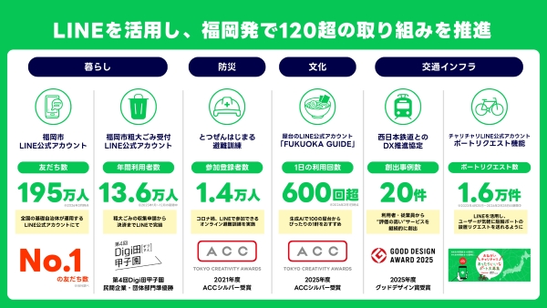 LINEヤフーコミュニケーションズと福岡市は、2016年の連携協定締結以降、行政情報の配信や手続きのデジタル化など、市民生活に関わる施策を継続的に展開してきました。現在までにその施策数は120を超えているといい、スマートシティ事業としての活動が着実に広がりを見せています。