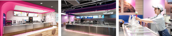 ショッピングモールをはじめとした商業施設内の店舗は、都会的な「STUDIOデザイン」にリニューアル。こちらはネオンサインやフレーバーがデザインされたパネルで彩られ、「アイスクリームの新しい楽しみ方を発信する場所」をイメージした先進的な空間となっています。