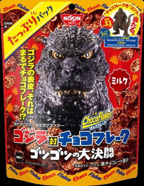 日清シスコ株式会社は、同社のロングセラーブランド「チョコフレーク」と、世界的な人気を誇る怪獣王「ゴジラ」によるコラボレーション企画「ゴジラ対チョコフレーク ゴツゴツの大決闘キャンペーン」を2026年4月27日(月)より開始します。