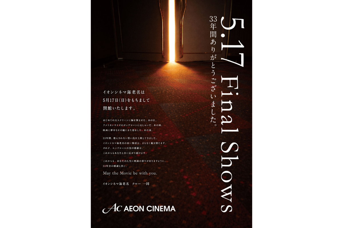 1993年4月に日本初のシネマコンプレックス(同一施設内に複数のスクリーンを持つ複合映画館)として開業した「イオンシネマ海老名(旧称:ワーナー・マイカル・シネマズ 海老名)」が、2026年5月17日(日)に閉館します。