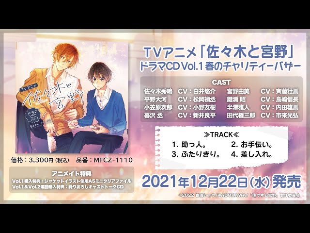 2022年1月アニメ放送スタートのTVアニメ「佐々木と宮野」から、ドラマCD、Vol.2の春園ショウ先生描きおろしジャケットイラスト、また詳細情報を公開!さらにVol.1の試聴動画も解禁! プレスリリース
