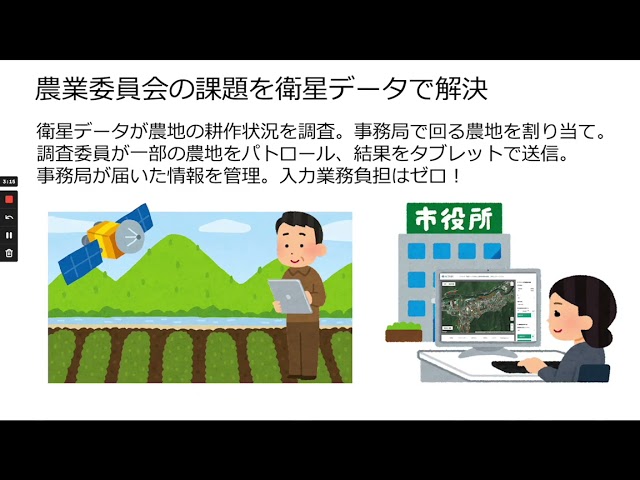 人類と地球の共存を実現する。サグリ株式会社です。本日、お話をするテーマは”耕作放棄地”についてです。この、耕作放棄地は滋賀県と同じ面積がございます。25年間でその面積は約2倍になりました。この耕作放棄地が増えてしまうと、国内の食料自給率の低下だけでなく、鳥獣害被害や雑草・害虫の増加など、大きな課題が生まれる原因となります。それらの課題を解決する窓口となるのが、全国約1700市町村に設置された農業委員会です。彼らは、毎年農地法に基づき、すべての農地を目視確認しています。また、全ての結果を紙からパソコンに手入力しています。これらのアナログの業務を解決するために、人工衛星データから得られる広域性、周期性の特徴に着目しました。衛星データを用いることで農地ごとの耕作状況を把握でき、パトロール調査の負担を改善することが可能です。本実証では、名古屋市の緑政土木局都市農業課および農業委員会西部守山農政課と連携をし、実証を行いました。今年度のプロジェクトのゴール設定としては、ビジネス展開に向けた全国への営業展開となるような実証を行うこと、そして、この実証実験を経て、ACTABAを改修することが目的です。これまでACTABAは導入及び実証実験含め、延べ約40以上の自治体と実績を積むことができました。また、当初のアプリケーションをアップデートし、農業委員会事務局向けのアプリケーションとパトロール調査をする農業委員向けのアプリケーションを実装しました。提供しているサービスはアクタバといいます。事務局側では、地籍調査図と農地台帳を用いて市内全体の農地のデジタル表示をしています。1筆毎に、その農地が耕作されているか否かを可視化し、耕作放棄地率という耕作放棄地に近しい割合を示す指標を導入し、目安にしています。また、条件設定をしながら、一部の農地をパトロールしてもらうため、パトロール委員ごとのアカウントを発行し、それぞれのアカウントに農地の割当をすることが可能です。農地の割当がされた委員は、タブレットを通じて、ワンタッチで結果を入力することができたり、写真を紐つけたり、マイク入力などが可能です。また、今いる場所から目的の農地までのルートを示すことができます。入力された結果は、事務局アカウントに瞬時に反映されると共に、結果がダウンロードすることが可能です。今年の実証プロジェクトの様子が以下の写真です。この実証実験は東海版の全国農業新聞や毎日新聞などに掲載をいただきました。名古屋市ではタブレットを活用した調査をすることで、従来の紙で行うよりもわかりやすく、便利であったという結果につながりました。一方で、名古屋市の住宅地の中に混合する農地に関しては、一部で果樹が植わっているなど、非常にAIによる判定精度の改善が必要と感じました。来年度は作付け調査について連携を図りたいと考えています。サグリはエンジニア人材の採用に積極的に力を入れています。ぜひ、我こそはという方はご応募下さい。https://mainichi.jp/articles/20211201/ddl/k23/020/152000c