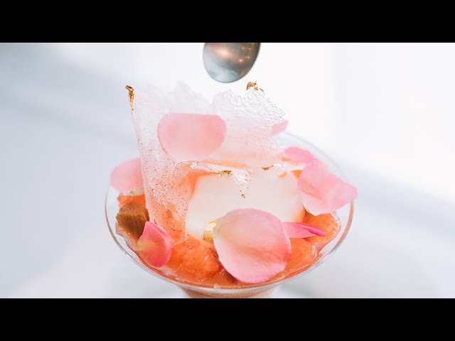 食用バラの香りと味を最大限に生かすために、バラとの相性を計算し尽くされた構成が特徴です。その構成は、ピンクグレープフルーツのソース、クランブル、和紅茶のクレームブリュレ、カンパリのジュレ、ルバーブのソルベ、薔薇のブランマンジェ、そして、そのまわりにルバーブのコンポートやピンクグレープフルーツ。上にはバラをあしらいました。
