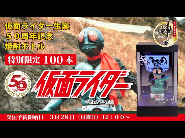 記念すべき50周年を迎えた仮面ライダーシリーズと大分の温泉水から作られた焼酎「神々」が数量限定ボトルの焼酎を発売します。