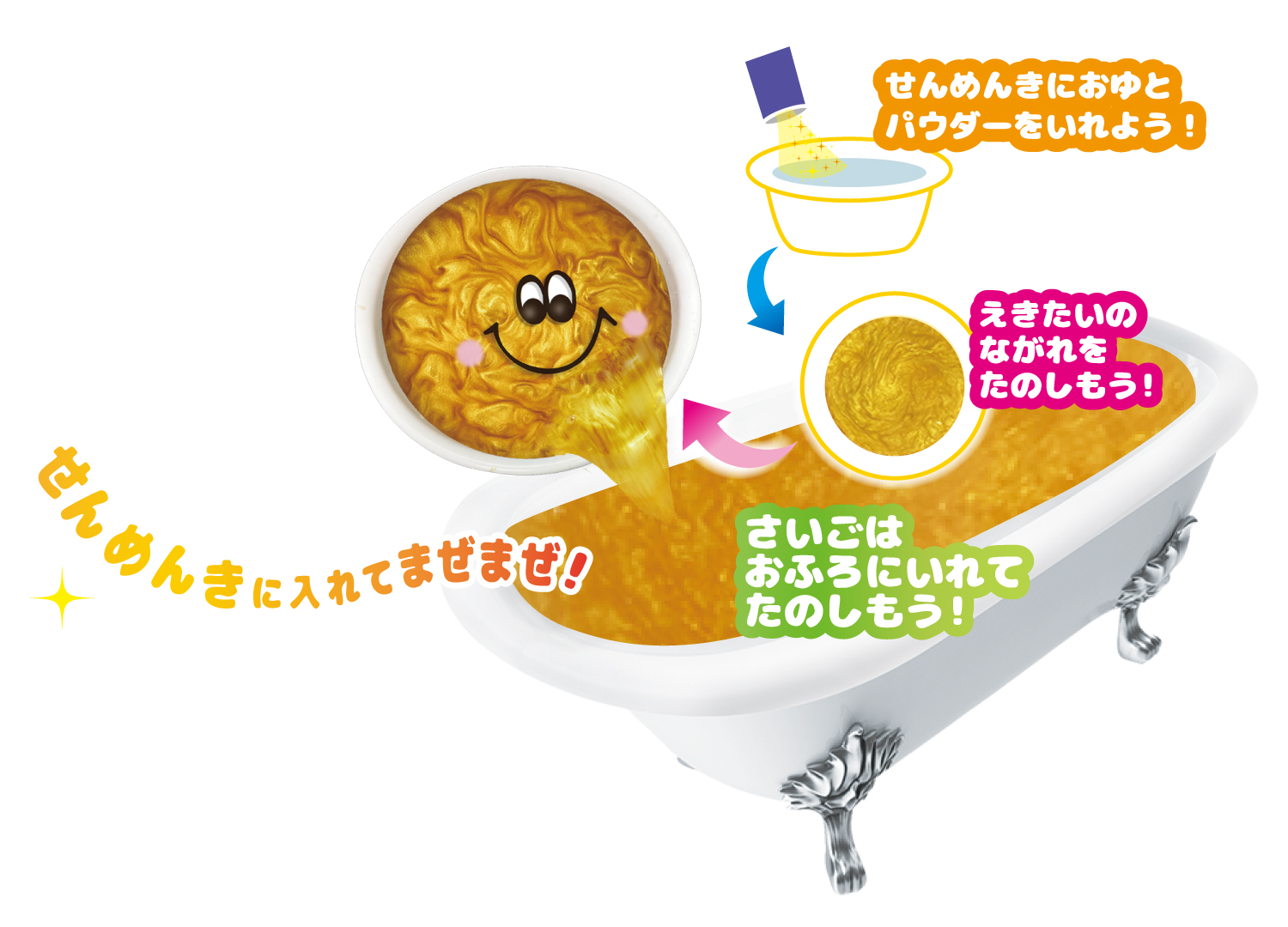 キラキラを動くお湯の動きを十分に楽しんだ後は、浴槽のお湯に入れかき混ぜ、キラキラのお風呂としてお楽しみください。