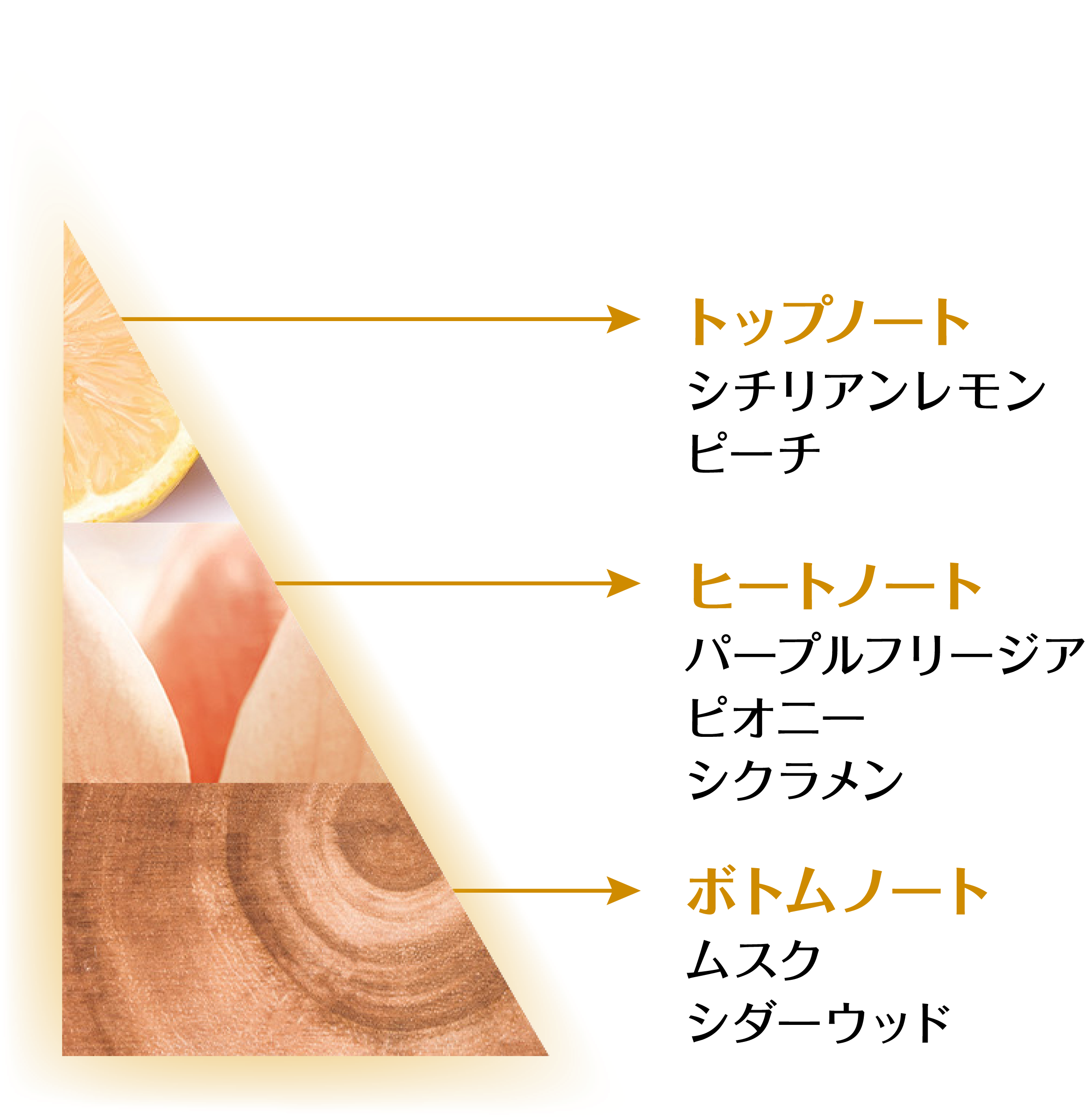 ピオニーとピーチのやさしい香りで、清潔感のある、軽やかで自然な印象を作り出します。