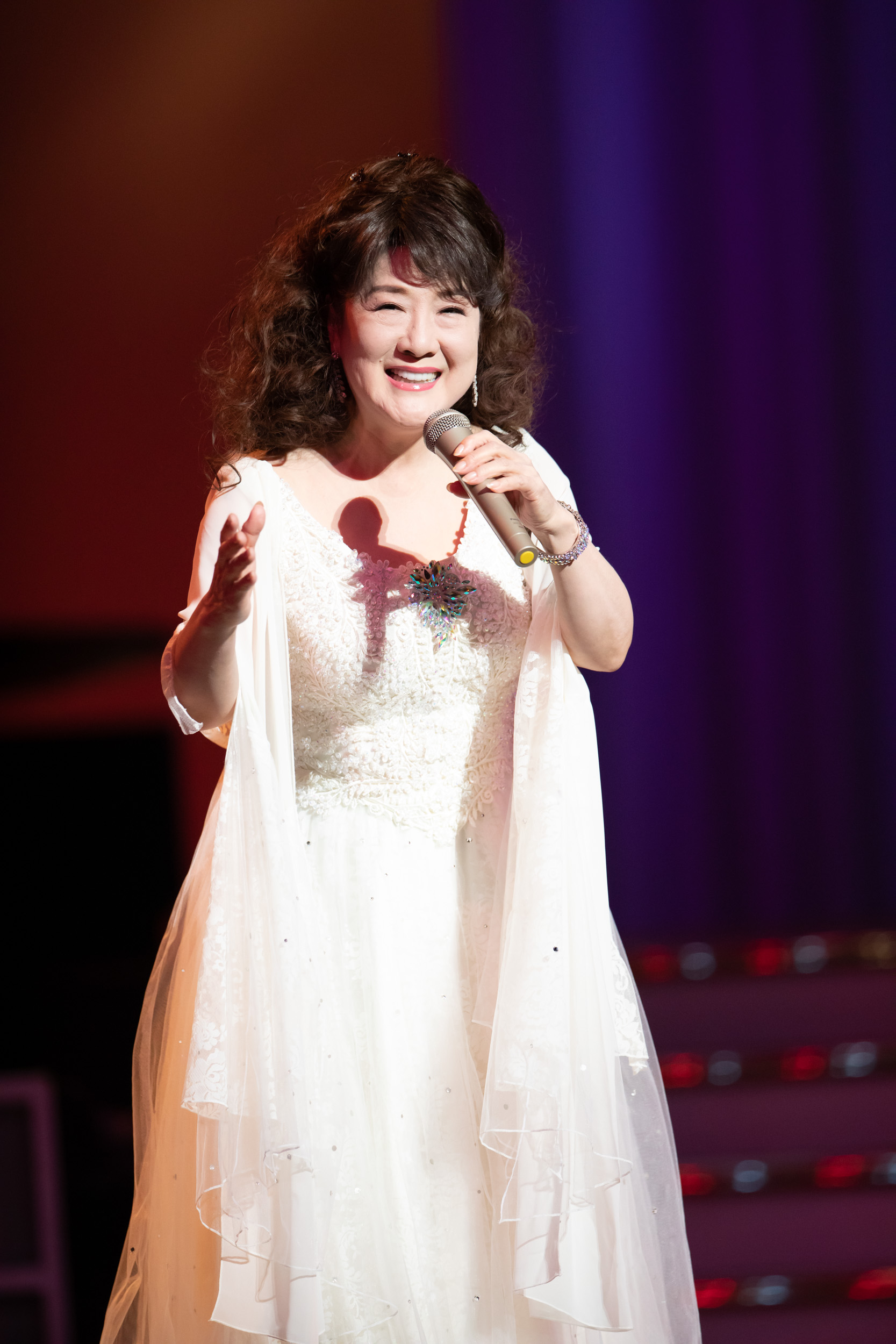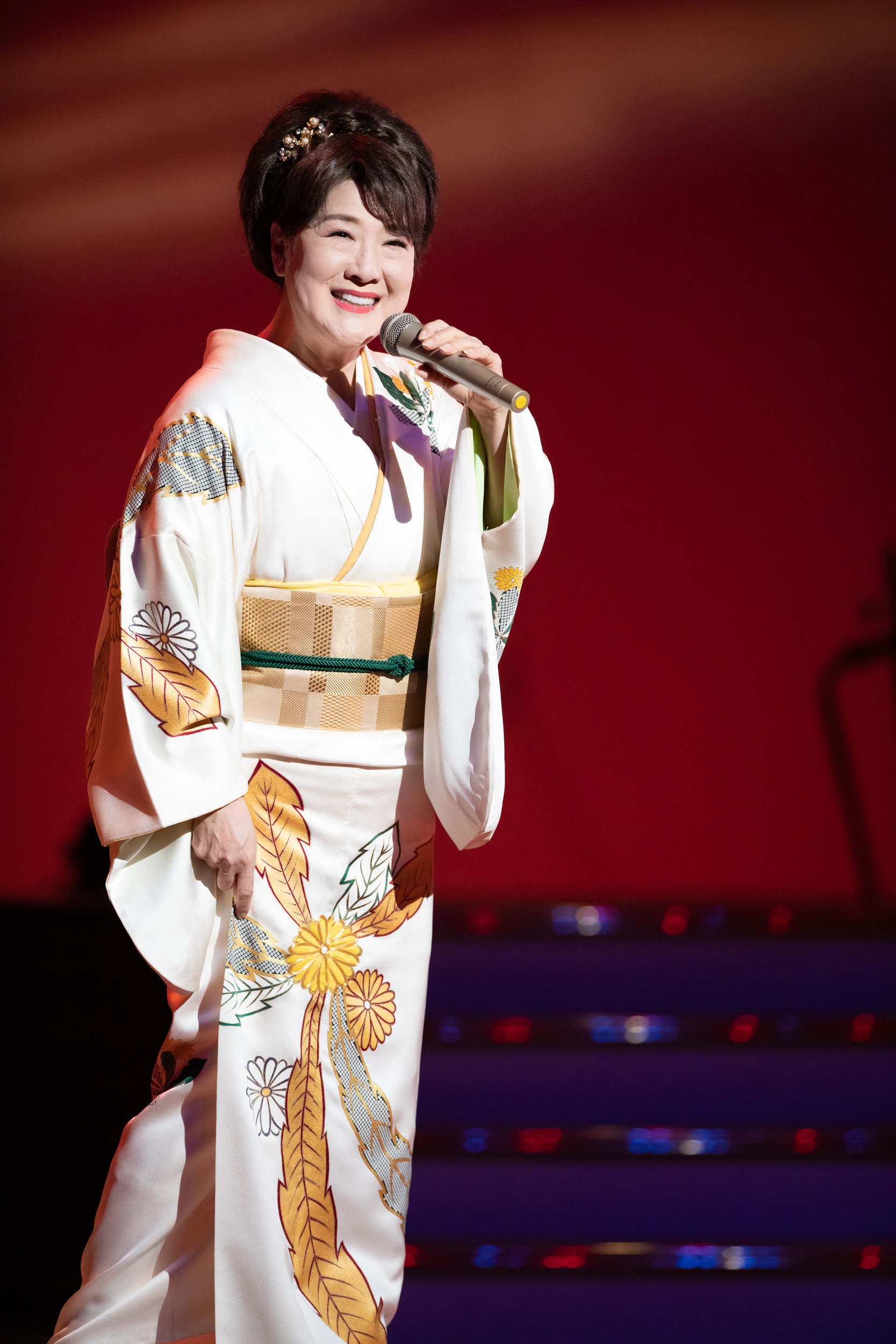 白のドレス姿で颯爽と登場し、30周年記念曲の『歌ひとすじ』を熱唱。その後は軽快なトークで観客を沸かせた。