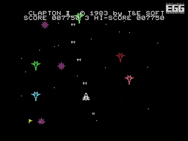 本作は1983年にリリースされたシューティングゲーム。プレイヤーは宇宙戦闘機クラプトンIIを操作して、迫りくる敵戦闘機と戦うことになります。敵や敵弾、機雷(?)に接触するとクラプトンIIを1機失い、残機がゼロになるとゲームオーバーとなります