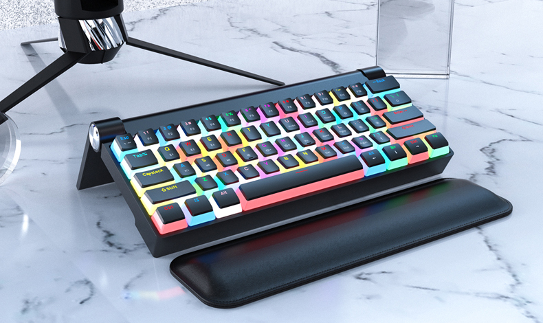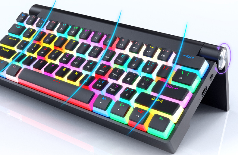 メカニカルキーボードK618は、様々な使用シーンや好みに合わせた形態がとれるよう、角度調節可能なスタンドを装備。