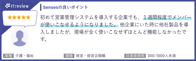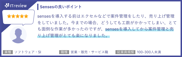 ITreviewにて、Sensesを実際に利用いただいているお客様よりたくさんのお声をいただいております。利用者からは「操作が簡単で分かりやすい」「案件管理や売上管理が楽になった」などのコメントをいただきました。