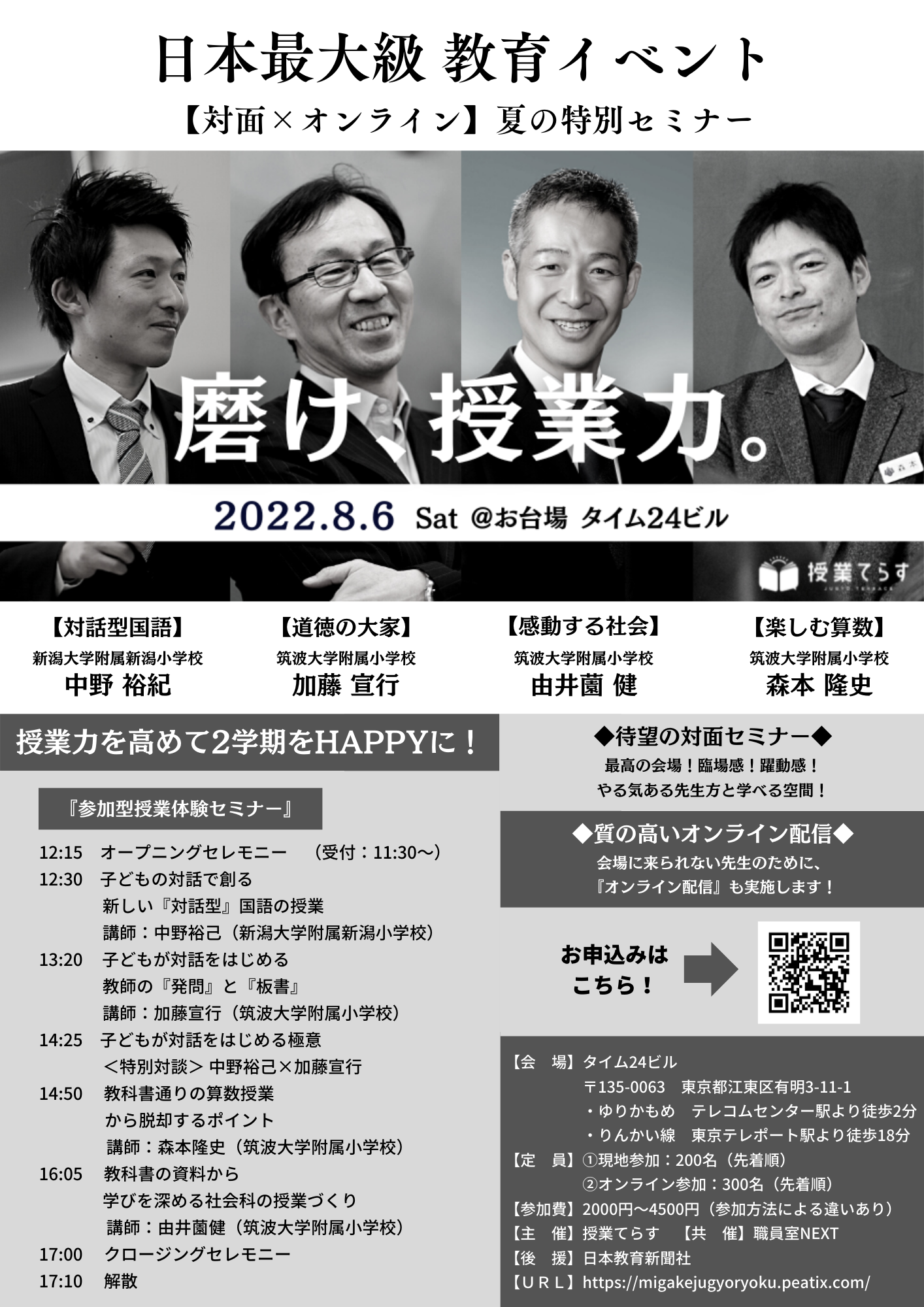 【8/6(土)開催】「授業てらす」主催、小学校教員向け授業力向上セミナー『磨け、授業力。』本日18時、募集開始 プレスリリース