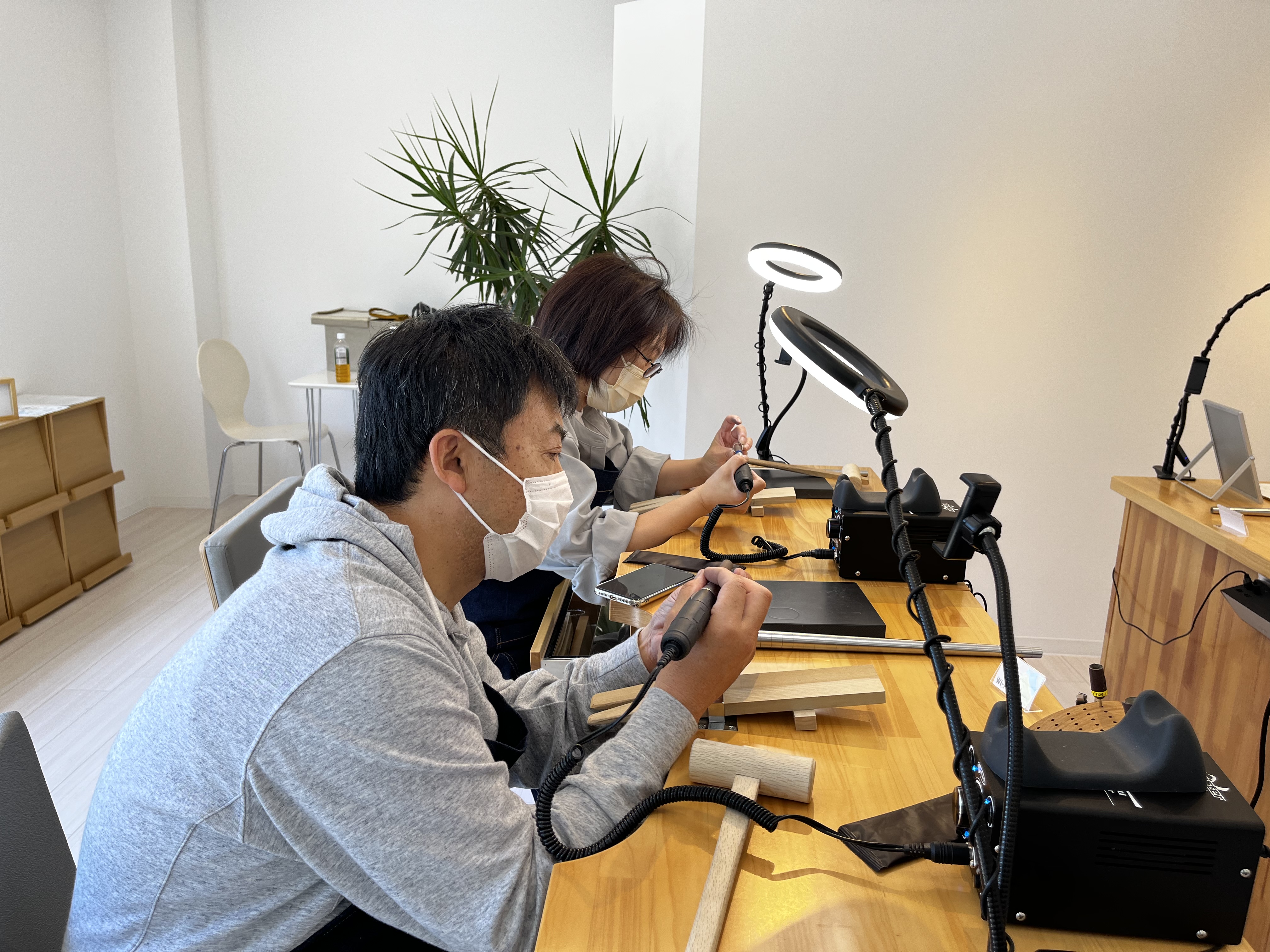 はじめての方でもプロの職人が丁寧にサポートするので安心して既製品と変わらない綺麗な指輪を作ることができます。作り終えたおふたりからは、『すごく楽しい!』『不器用な私でも既製品と変わらない綺麗な結婚指輪が作れた!』『世界で一つの婚約指輪が作れた!』などみなさん喜んでいただいおります。ダイヤモンドや誕生石を留めたり、難しい作業は職人を行いますので、安心して製作できます。