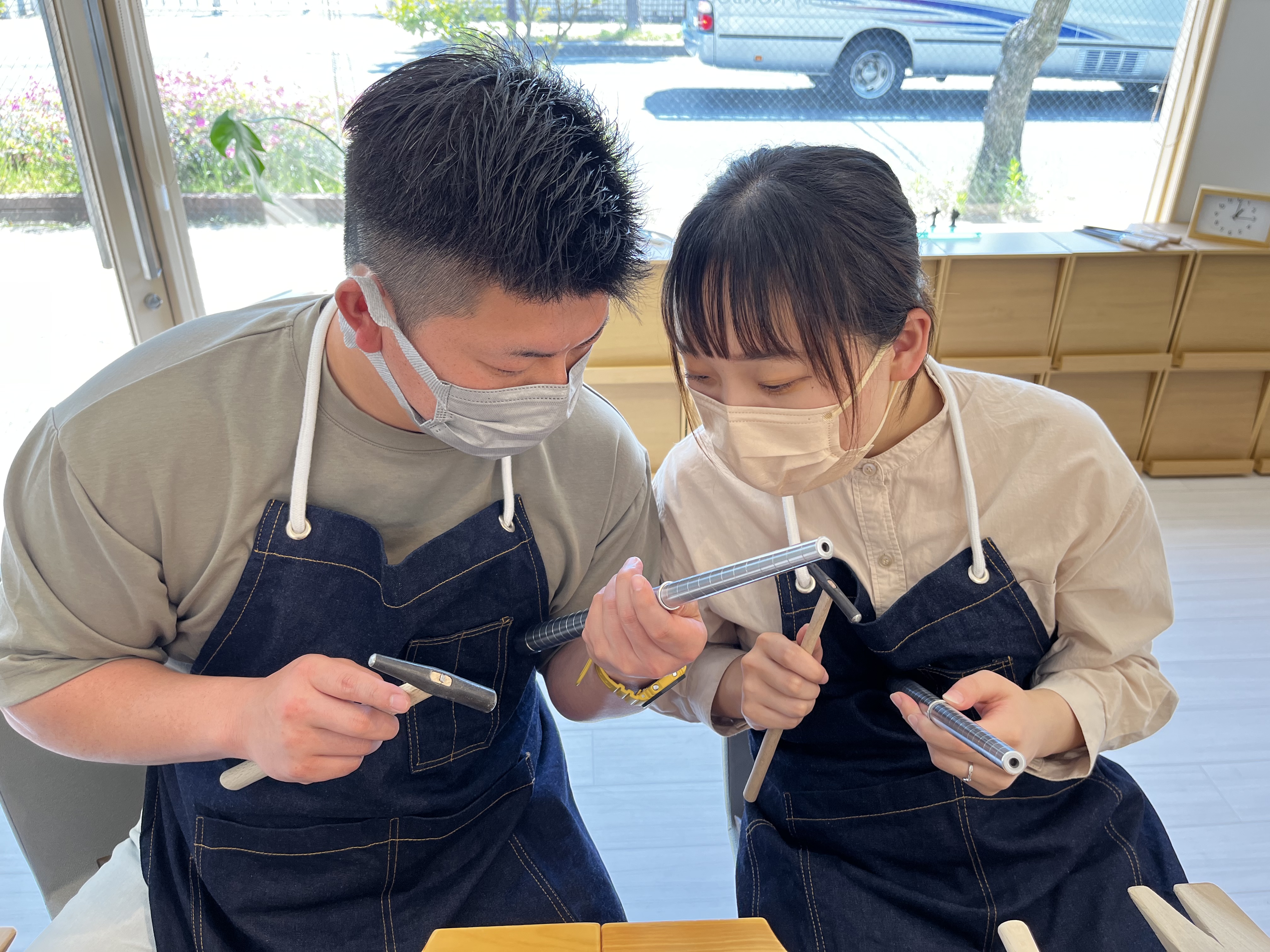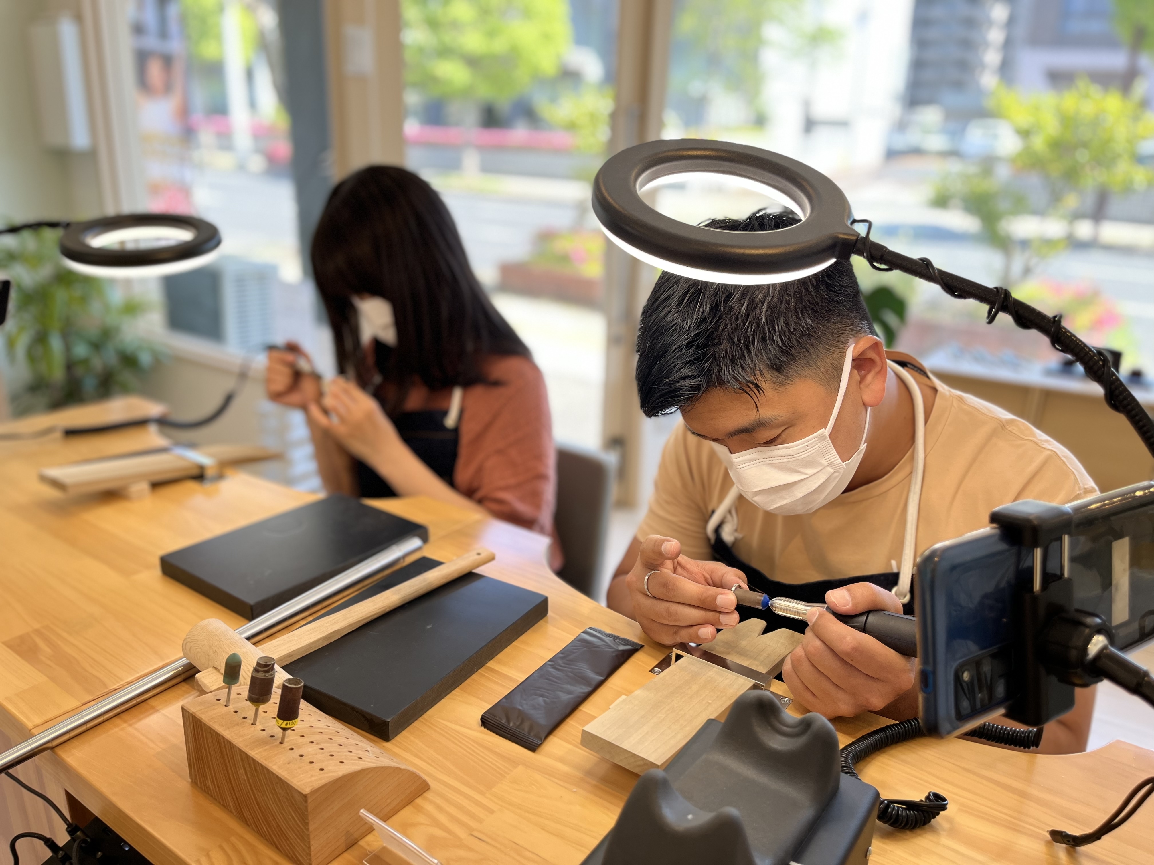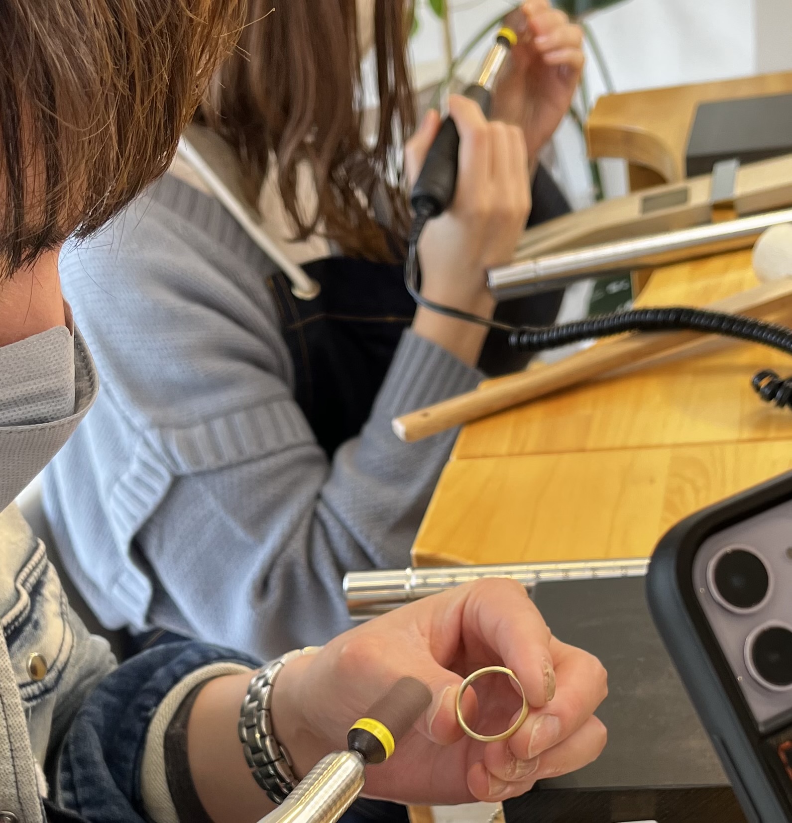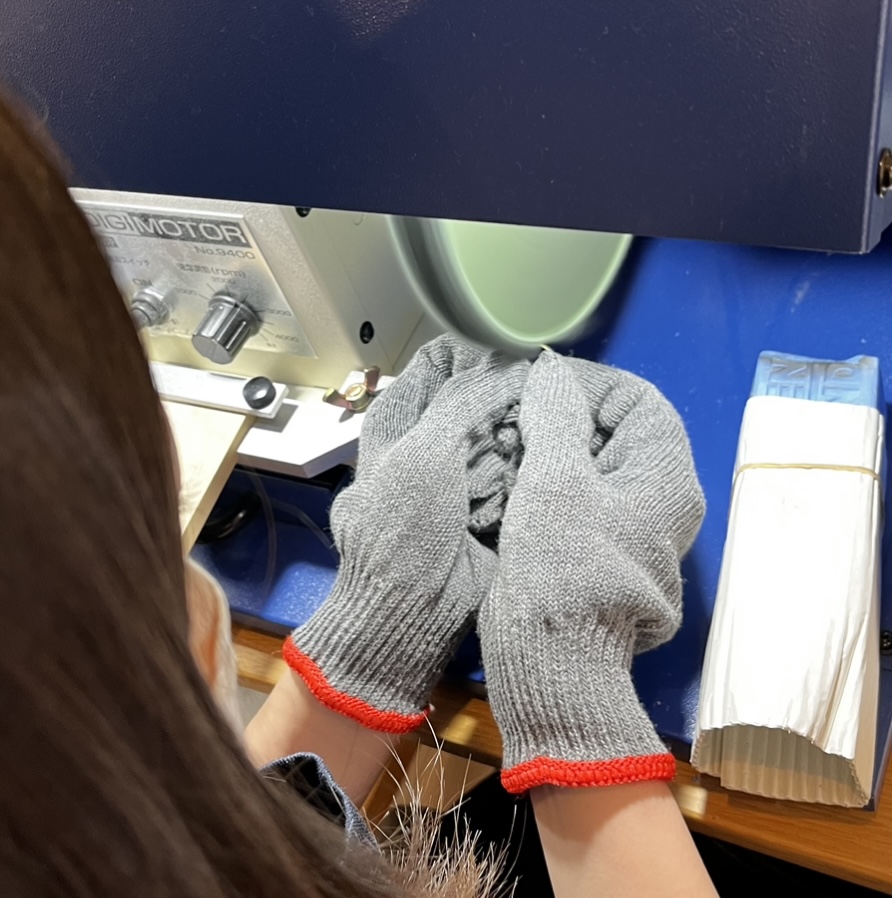 「1から指輪を作るというのが体験できてめちゃめちゃ楽しかったです!指輪見返しても棒状の物が綺麗な丸になって感動します!初めて指輪作りをさせていただいたのでとても貴重な経験になりました。1枚の鉄の板を渡して頂き、作業を始め、ピカピカの指輪になったときはとても感動しました。不器用な私でも、1から丁寧に教えてくださりひとつひとつの工程を楽しんで行う事ができたので、あっと言う間でした。世界に一つだけの指輪を作れるのが、素敵だと思ったし、素敵な思い出が出来ました。あと、スマホスタンドが設置されており、作成中の映像を撮ることが出来たので思い出を映像として残せるのもいいなと思いました。」