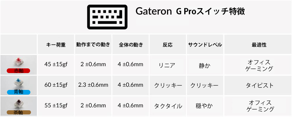 クラシックなクリック感とスムースなタイピングの両方を愛する人のために、K4はGateron G Proスイッチのオプションも選択できるようになっています。Gateronスイッチのオプションを3種類(赤軸、青軸、茶軸)ご用意しています。