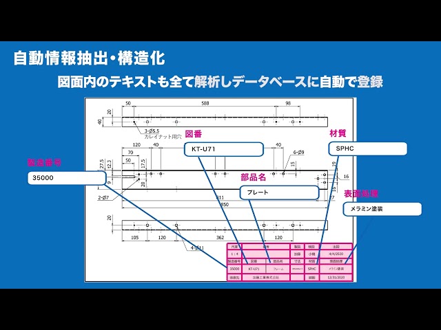 図面をアップロードするだけで図面内のテキスト情報を自動で解析。データ化し、すぐに検索できます。また、図番/品番/材質/表面処理といった付帯情報を自動で構造化してデータ化します。