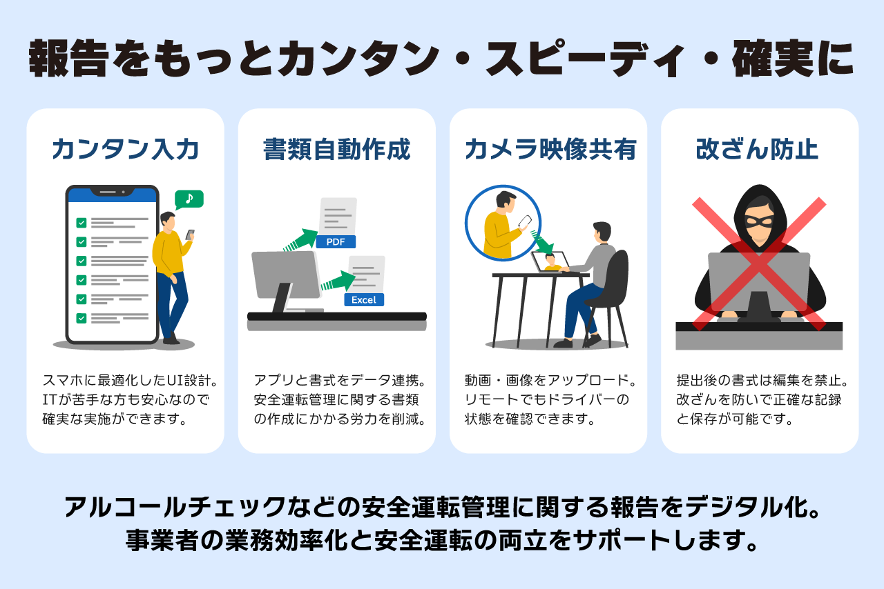 ドライバーのスマホを報告端末として活用し、アルコールチェックなどの車両管理に関する報告・記録をデジタル化。