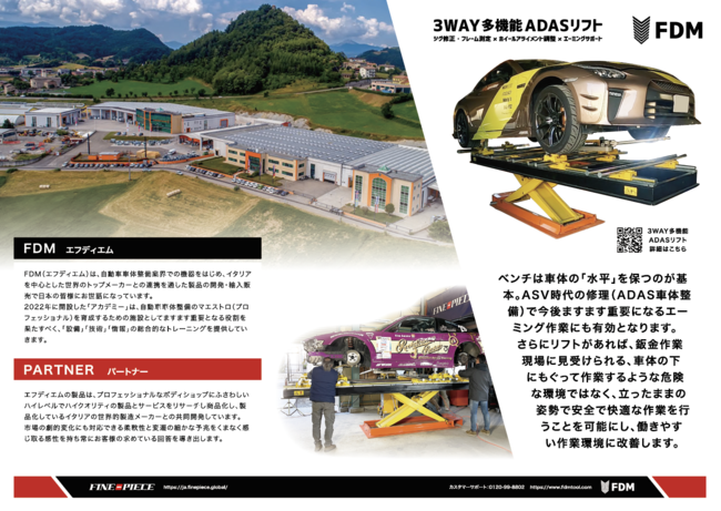 エフディエムでは、2022年3月4日、法改正案が閣議決定され遂に自動運転「レベル4」が解禁され、2024年10月からのOBD検査(車検)が目前に迫る中、今後自動車に導入される先進運転支援システム(ADAS)に採用されるセンサー類のキャリブレーションの前提条件として必要となる機能を網羅した「3WAY多機能ADASリフト」の導入を通して、補修・車体整備業界の維持発展に寄与するとともに、安全な自動運転社会の実現に貢献することを目指している。