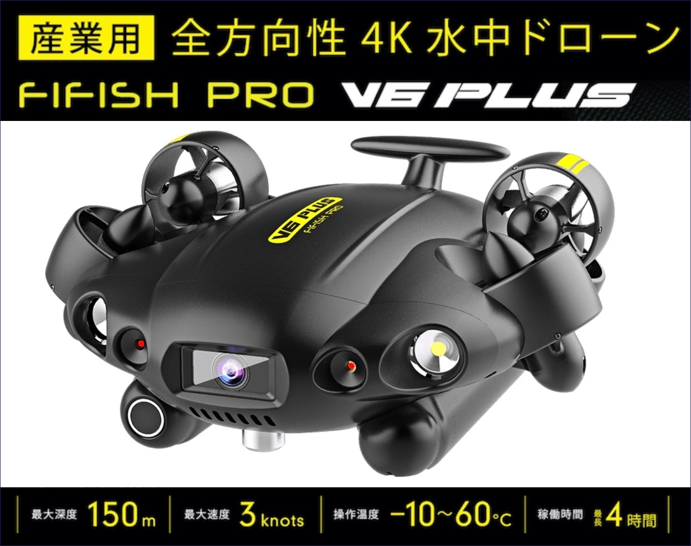 最大深度 150m/最大速度 3knots/稼働時間 最大4時間の高い基本性能に、高光量6000ルーメンのLEDライト、対象物との距離をロックするソナー、ターゲットのサイズを自動測定可能なレーザースケーラーを標準搭載する、作業性能を飛躍的に高めた産業用水中ドローン。水中探索・ダム・水力発電所の検査・橋梁点検・養殖調査・船舶調査等に活用されており、ロボットアームやウォーターサンプラー、陸上からの外部給電システムなどの拡張インターフェイスを利用可能です。