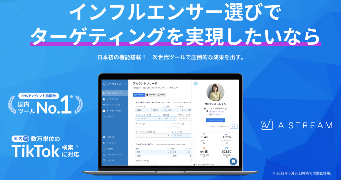 人気急上昇中の美容系インスタグラマーが網羅できる!?インフルエンサー検索ツール「Astream」が美容企業様のリストアップサポートを期間限定で”無料”で開始 プレスリリース