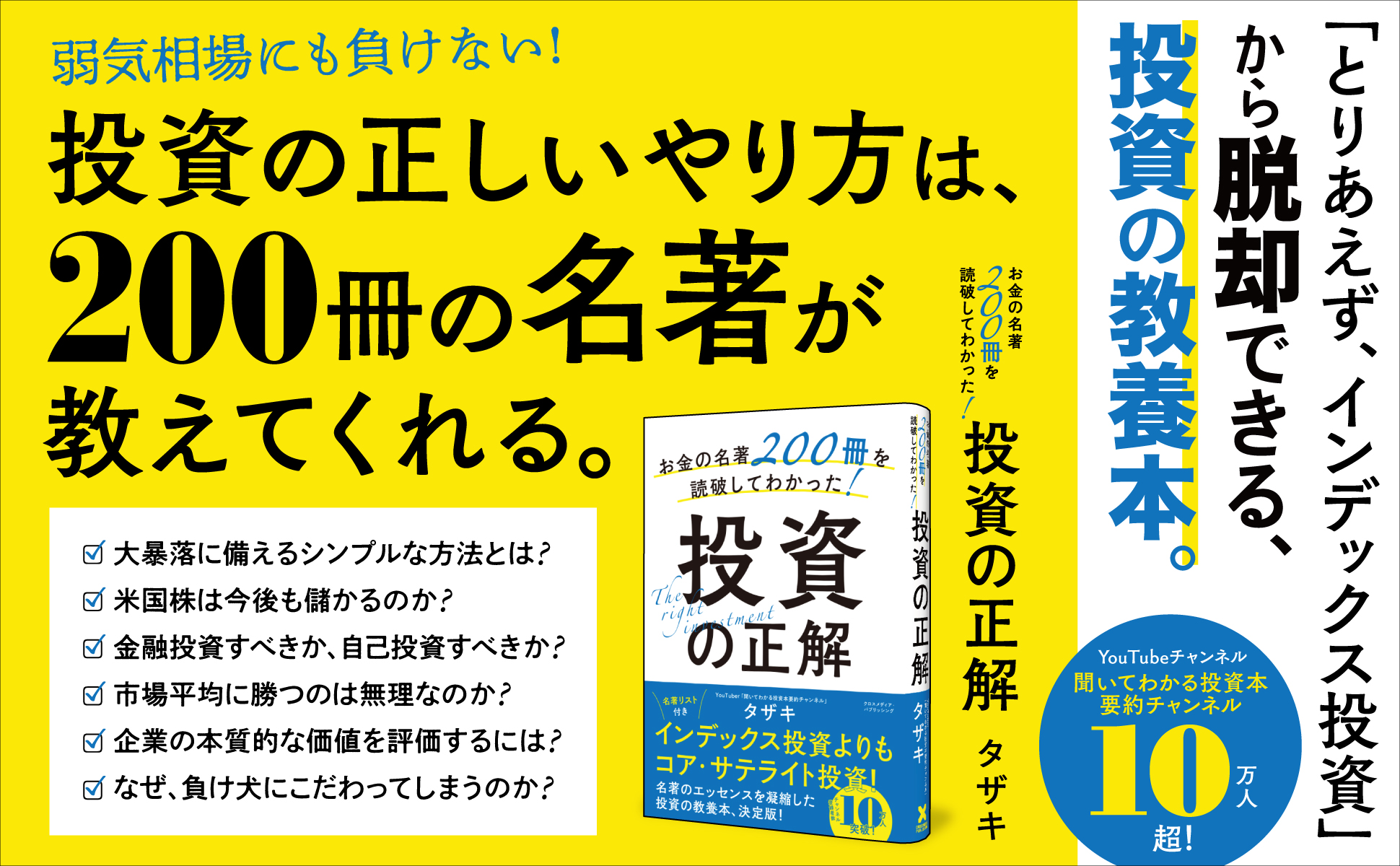 本書は、たくさんの本を読む時間はないけれど、幅広いお金の知識を身につけたい人たちに向けて執筆されました。著者は、お金や投資に関する本をこれまでに300冊以上読み、200冊以上を要約してきた人気YouTuber、タザキ氏です。タザキ氏が運営するYouTubeチャンネル「聞いてわかる投資本要約チャンネル」の登録者数は11万人を超え(2022年6月24日現在)、投資初心者から中級者まで幅広く支持されています。