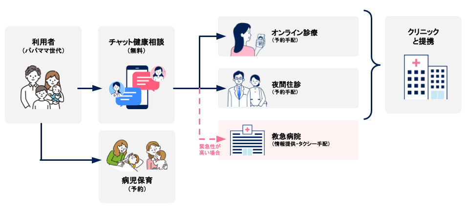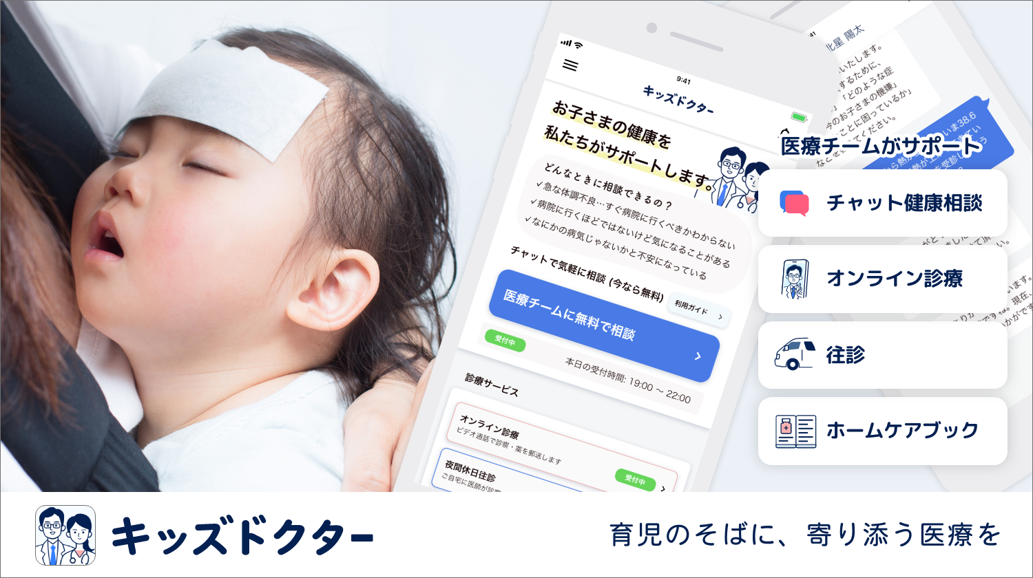 一方、ノーススターは、小児の時間外の健康相談アプリ「キッズドクター」を通して、チャット健康相談やオンライン診療・夜間往診の予約支援サービスを提供しています。