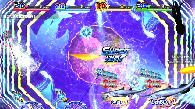 お家でもJoy-Conを振って回して、釣りの体感操作を楽しむことができます。前作でプレイできたステージはもちろん、「蛙ノ池」や「花吹雪の大渦」などゲームセンターの新ステージや 「毒の花畑」などNintendo Switch版オリジナルステージが追加。また、今作では最大4人までの同時プレイも可能になりました。