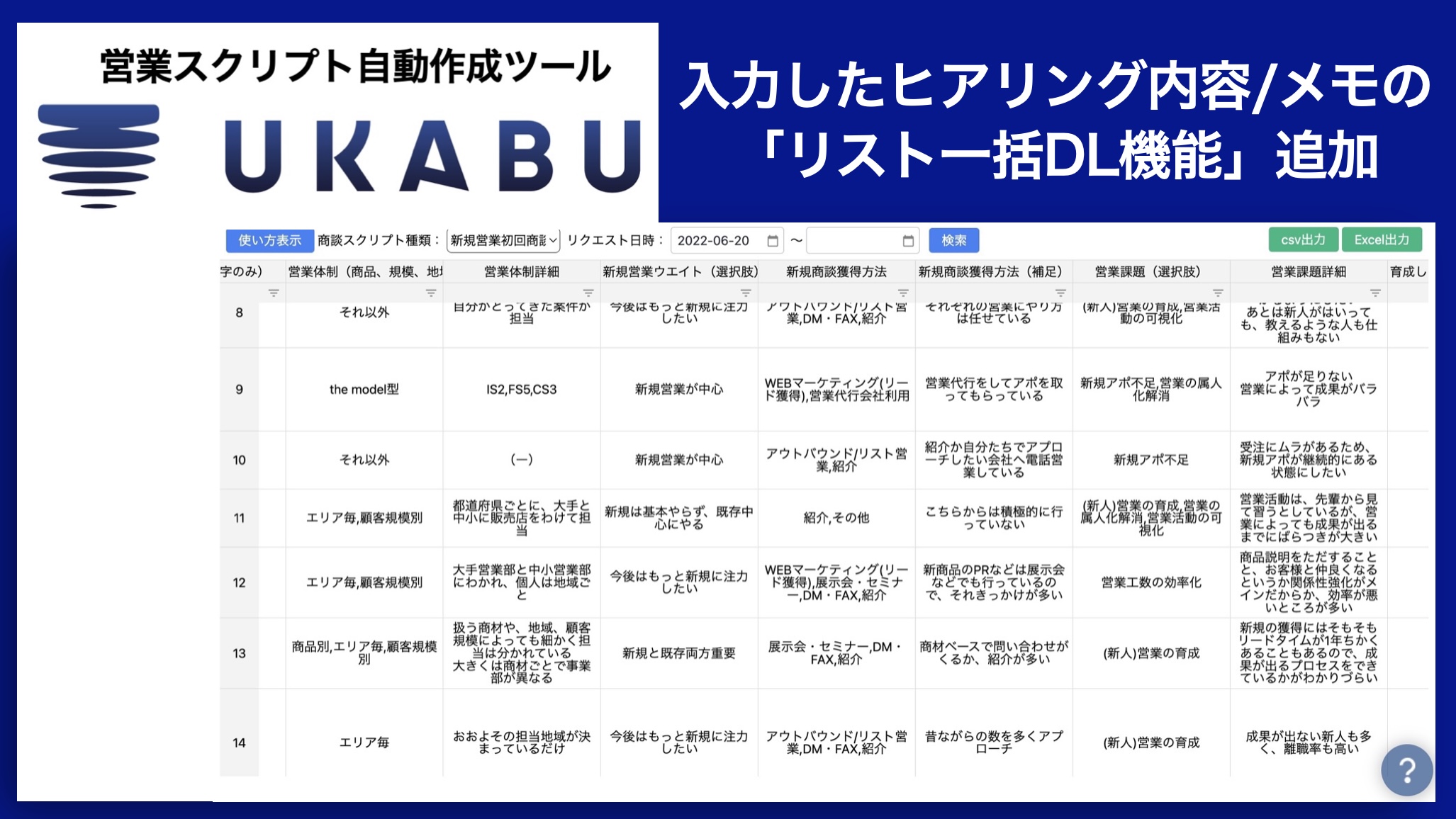 営業スクリプト自動作成ツール「UKABU(ウカブ)」がcsvやexcelファイルで出力できる「リストDL」機能を追加! プレスリリース