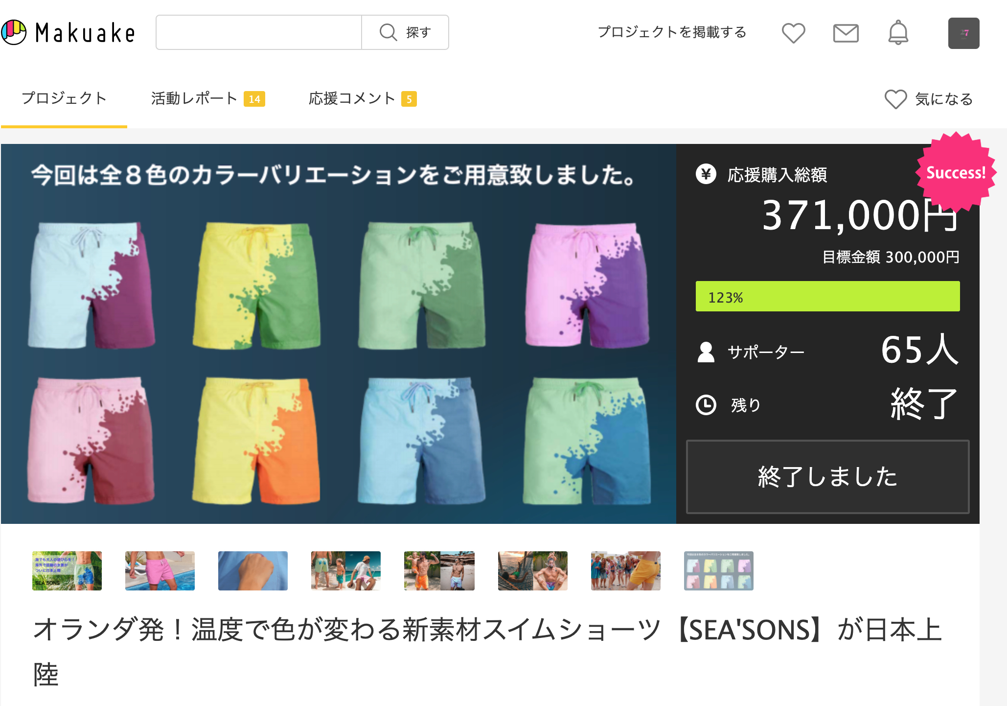 2018年に海外のクラウドファンディングサイト「Kickstarter」にて、わずか開始13時間で目標金額EUR 15,000 (日本円 約200万円)を達成。最終総額EUR 28,941(日本円 380万円)に到達し商品開発が実現した、海外でも話題のアパレルブランド『SEA'SONS』
