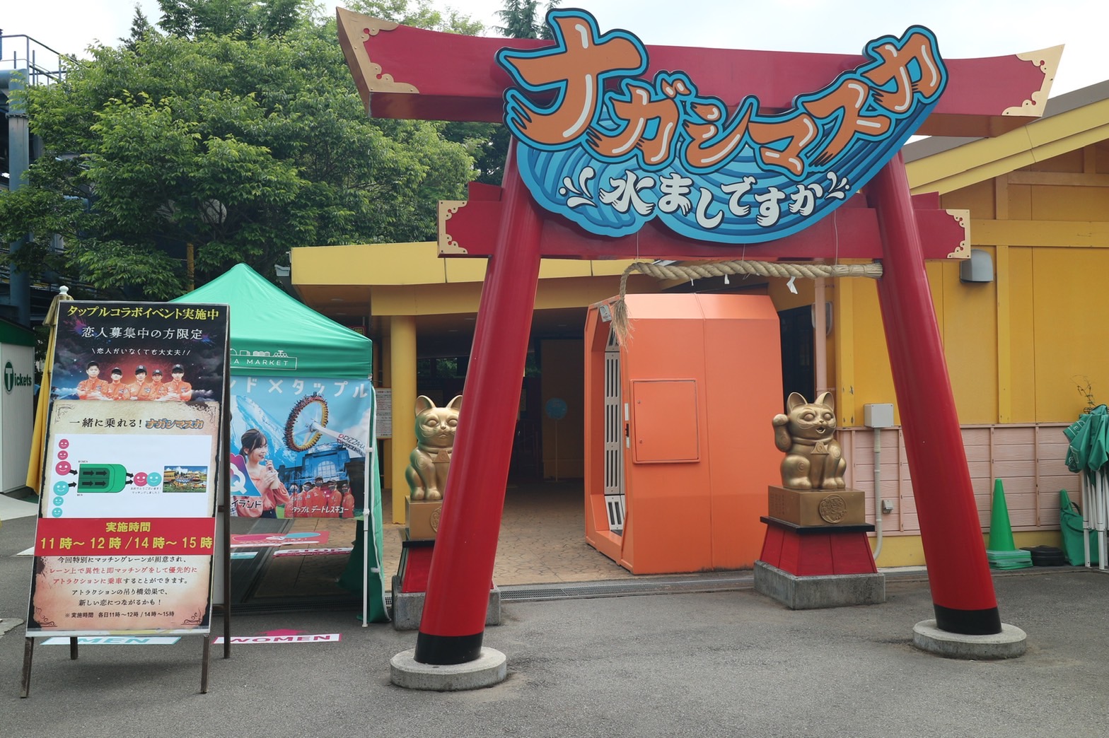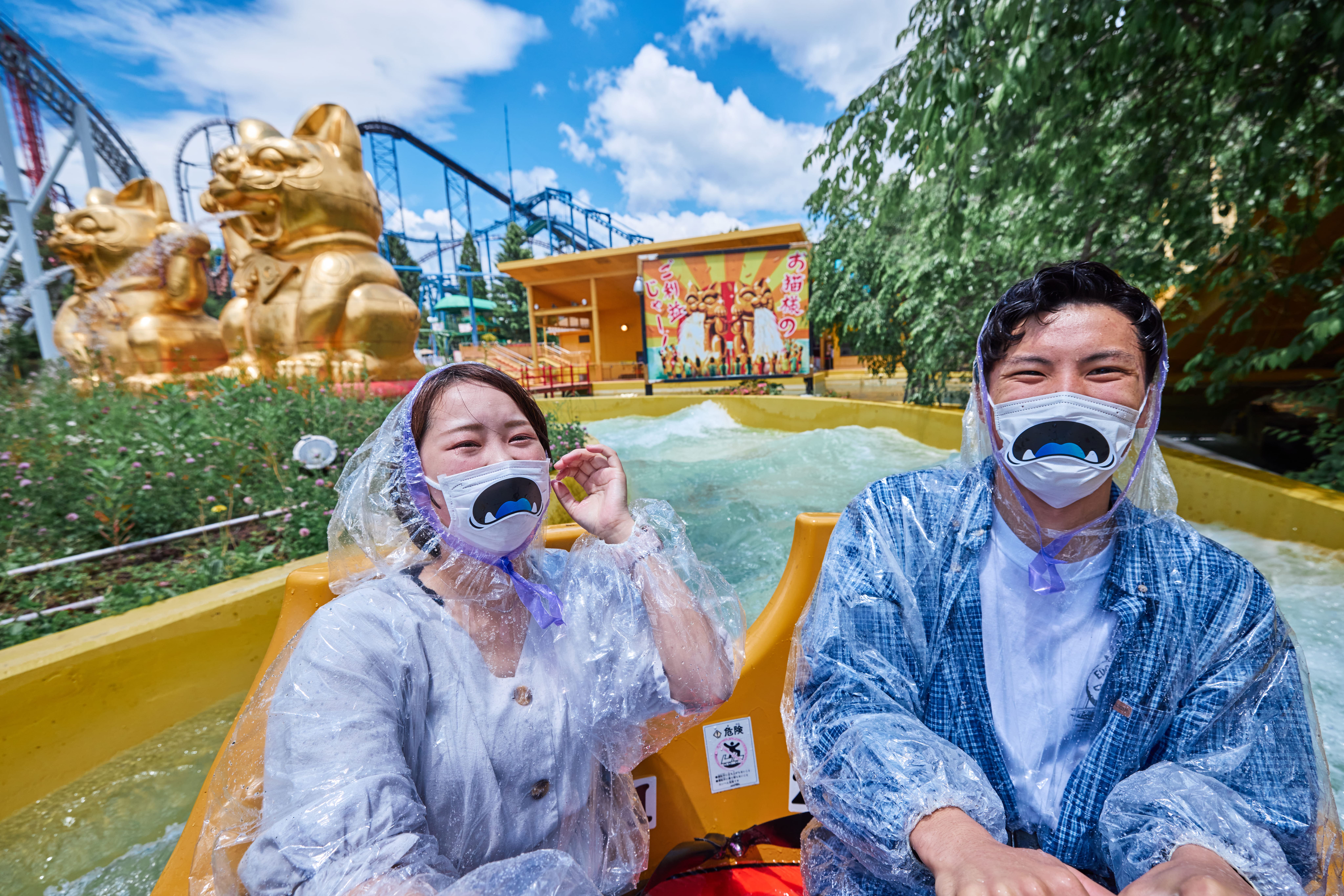 4人乗りの円形ボードに乗って激流を下るラフティングアトラクション「ナガシマスカ」ではリアルマッチングイベントを実施。恨めしそうな顔をしたおばけがモチーフの「シングル用マスクシール」を装着した恋人募集中の方や友だち同士のグループの方に楽しんでいただきました。