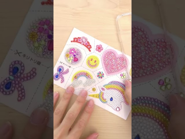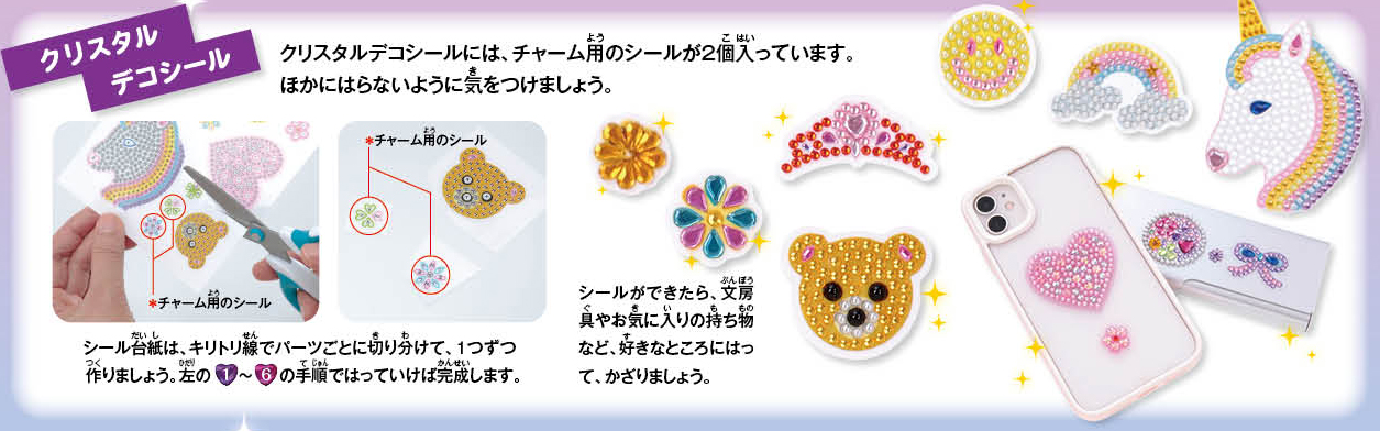 ユニコーン、クマ、ハート、お花など女の子の大好きなモチーフのクリスタルデコシールは、筆箱やケータイカバーなどにはって、キラキラに盛るデコ体験ができます。