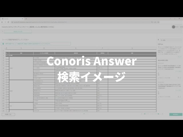 - システム上にシートが表示され、設問をクリックすることで、過去の回答の中から類似する設問と回答をシステムで自動検索し、画面右側に結果を表示