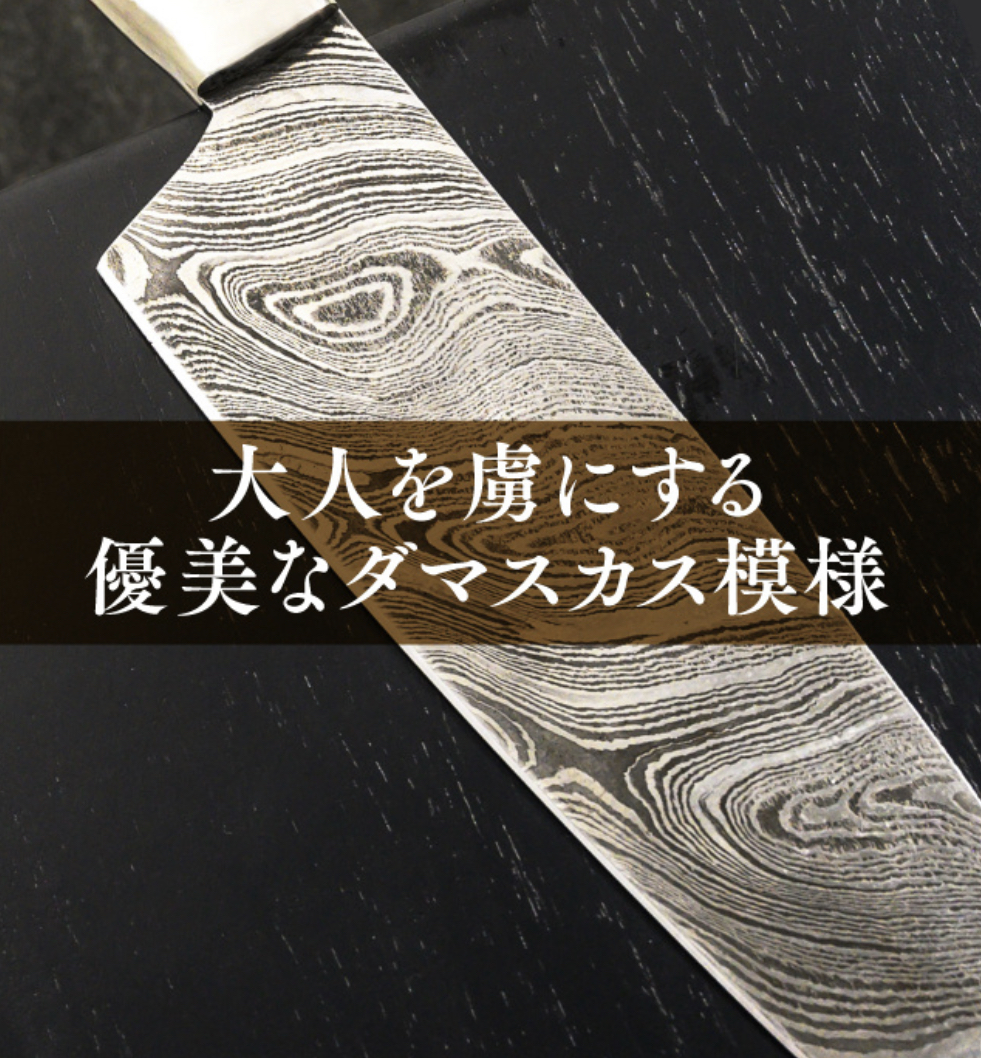 ダマスカス模様は熟練した職人の特殊な技術が必要なため、大量生産ができず、希少価値が高いハイグレードなナイフです。