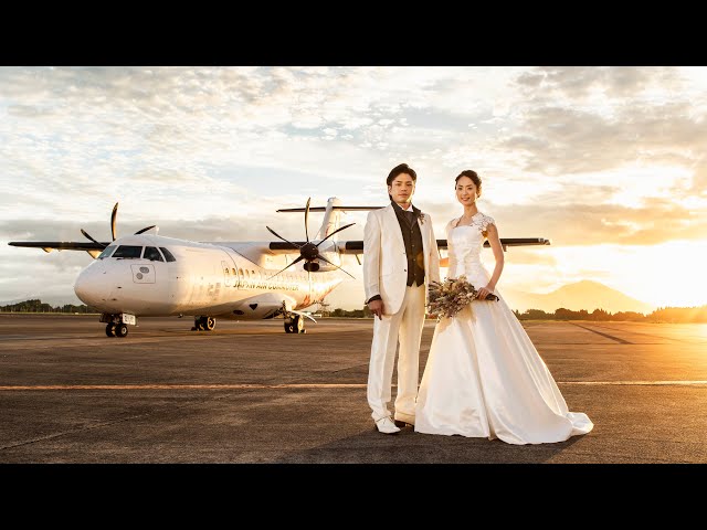 大勢が集まる結婚式という形ではなくても、二人だけの一生の思い出を作っていただきたいと願い、鹿児島と離島を中心に地域を結ぶJAC機と霧島連山を背景に、朝焼けと共に撮影します。