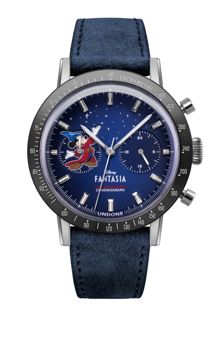 ディズニー作品の原点とも言われる、1940年に公開された『ファンタジア』をモチーフとしたクォーツ式モデル。美しく輝くサンレイダイアルとタキメーターベゼルが大人の雰囲気を演出。