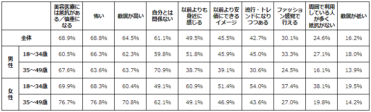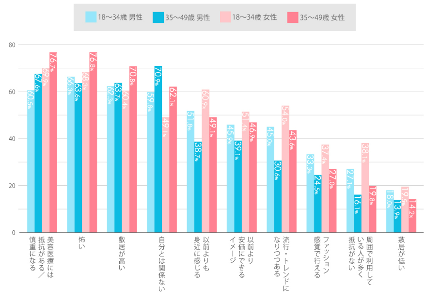 美容医療に対するイメージで高い割合を占めたのは、『抵抗がある』68.9%、『怖い』68.8%でした。やはりまだ気軽に「美容」として日常に取り入れるには少し難しい様子です。しかし、『以前よりも身近に感じる』が49.5%と、約半数の方が身近に感じ始めている傾向にあります。特に18〜34歳の女性では、60.9%と全体と比較して10ポイント程度高く、『流行・トレンドになりつつある』や『ファッション感覚で行える』『周囲で利用している人が多く抵抗がない』という回答でも、同様の結果となりました。