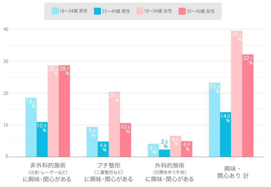 非外科的施術やプチ整形などの身体への負担が少ない美容医療が増えてきていますが、過半数の方は興味・関心がないということがわかります。男性よりも女性の割合が高く、特に18〜34歳の女性で興味・関心がある割合が39.5%と全体の割合より12.8ポイント高い結果となりました。
