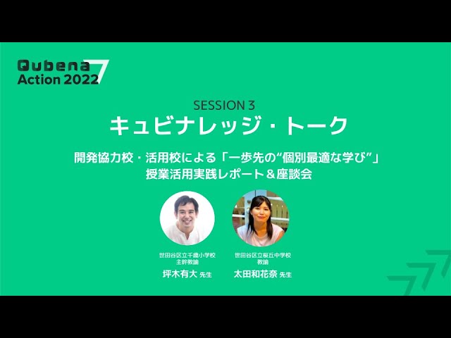 8月20日に開催した2023年度Qubenaプロダクト発表イベント「Qubena-Action 2022」にて、開発協力校・活用校のお二人の先生をゲストに迎え、トークセッションを開催いたしました。同セッションでは、世田谷区立千歳小学校の坪木先生・桜丘中学校の太田先生のお二人に、それぞれのQubenaを活用した授業実践について発表いただき、その後、「授業をする上で大切にしているものとは?」「COMPASSやQubenaに今後期待することは?」という2つのテーマでご意見を交わしていただきました。