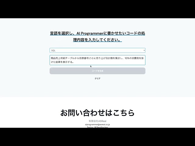 例えば、消費税を合算した金額を調べたい時に、「商品売上明細テーブルから伝票番号ごとに売り上げ合計額を集計し、10%の消費税を掛けた結果を表示する。」と指示を出すとどうなるかを動画にしてみました。