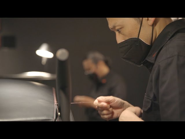ボディの表裏の縫い合わせ部分に敢えて手縫いで意匠性の高いステッチを施すことで、素材同士の収まりの美しさを引き出し、強度と美しさを併せ持った特徴的なデザインステッチにまで昇華させました。指先の感覚を頼りに針と糸を巧みに操りながら繰り返される緻密な作業は、熟練の職人ならではのもの。職人たちの優れた感性とていねいな手しごとに支えられた名品です。