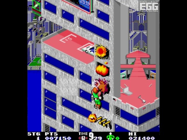 ビルを登っていると窓から炎が吹き出すことはもちろん、新聞紙の燃えカス、鳥、ブロック、飛行するプロペラなどのお邪魔キャラが登場。終盤では巨大な火の塊が弧を描いて飛んでくることも……。もちろんビルを登りながら途中で人々やペットを救出することも忘れずに!