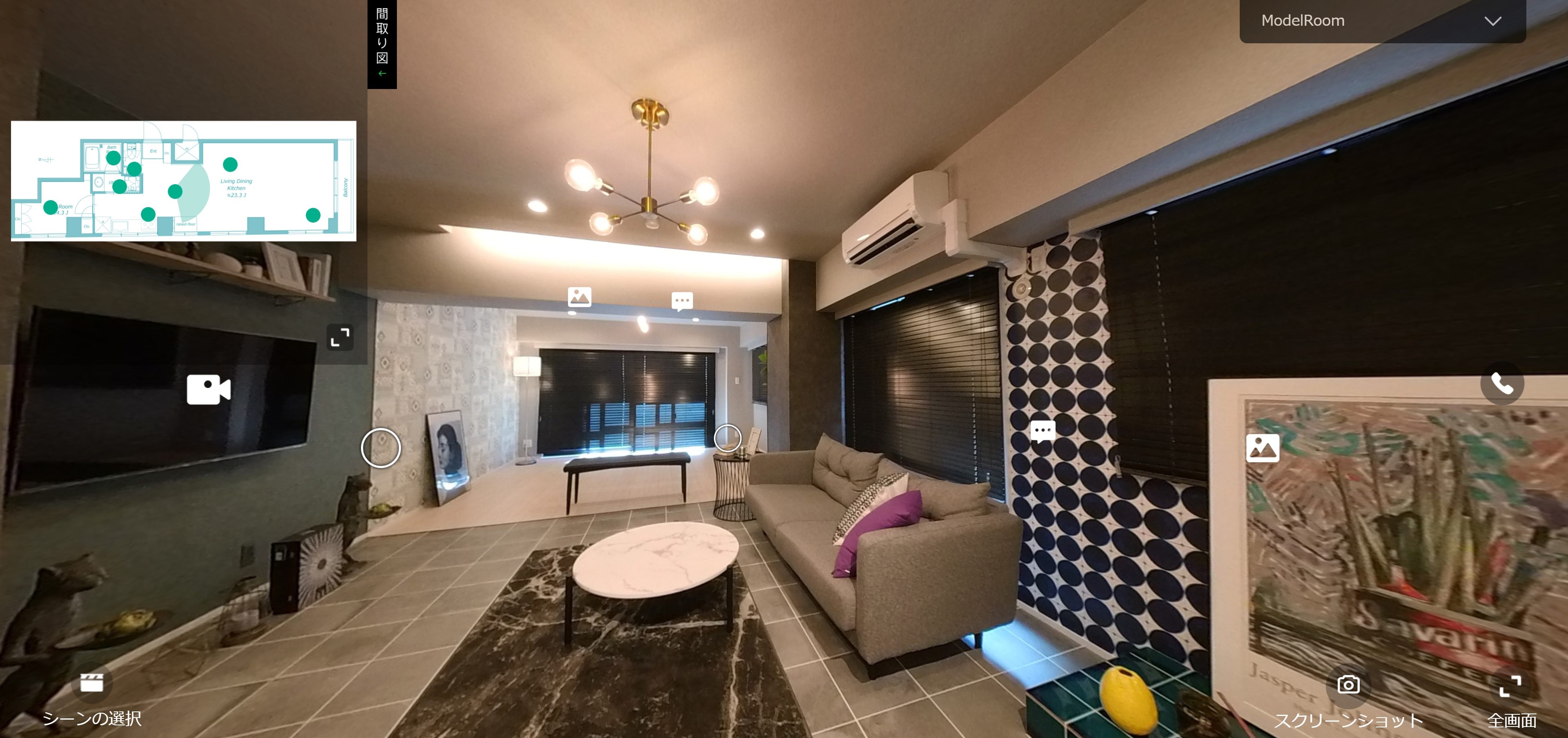 360°カメラとHOME360で撮影したパノラマ画像から、物件のバーチャルツアー※を作成します。ツアー上に、コメント、画像、動画、リンク等の設定が可能で、物件の魅力や事業者様のPRポイント等を自由に追加して頂けます。