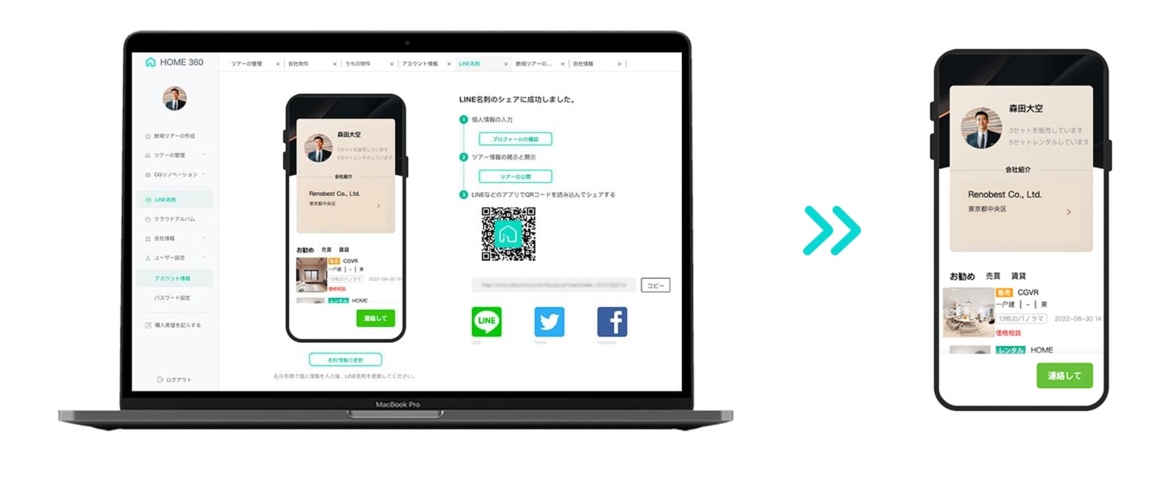 HOME360で作成したVRツアーは、URL・QRコードから閲覧したり、システムから各種SNSへの投稿が可能になります。また、現在開発中のLINEの企業専用ページをご利用頂くことで、取扱物件の一覧の表示や、おすすめ物件設定、お客様へのタイムリーなコミュニケーションが可能となります。