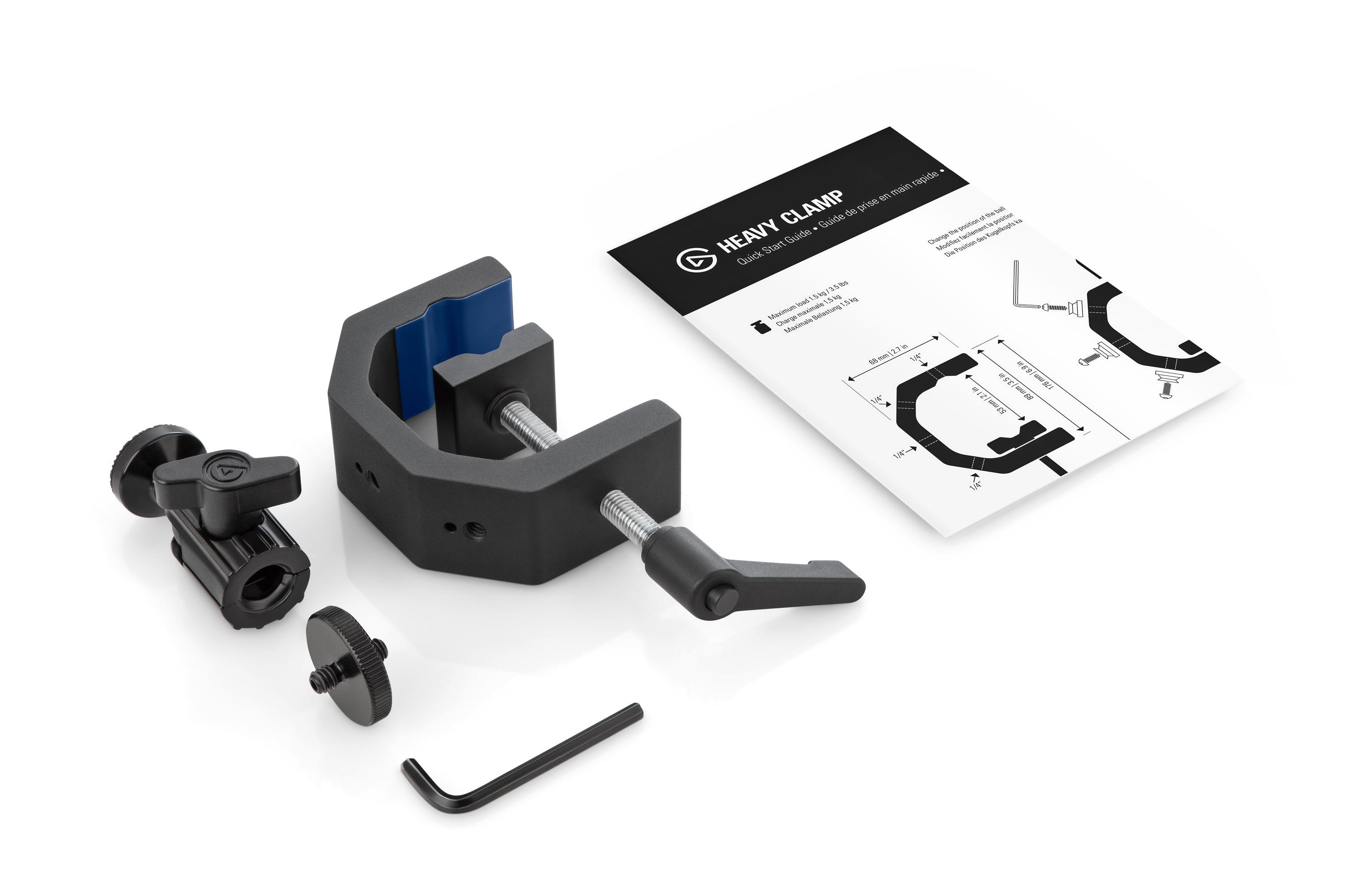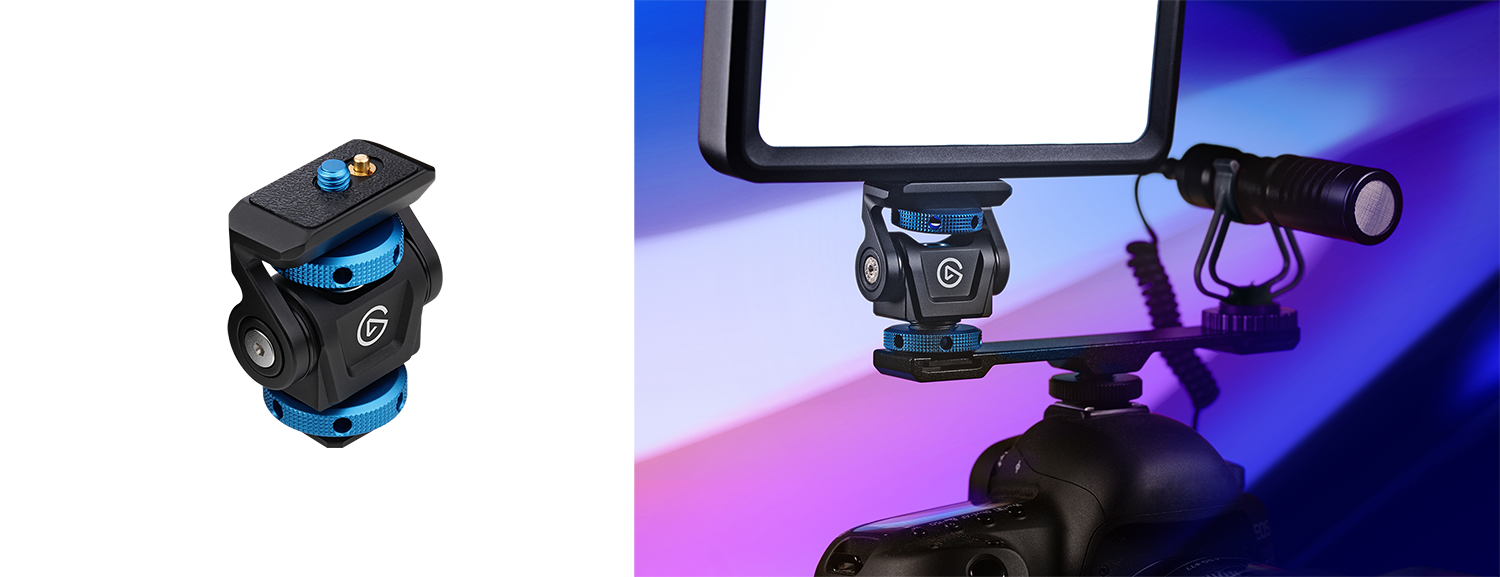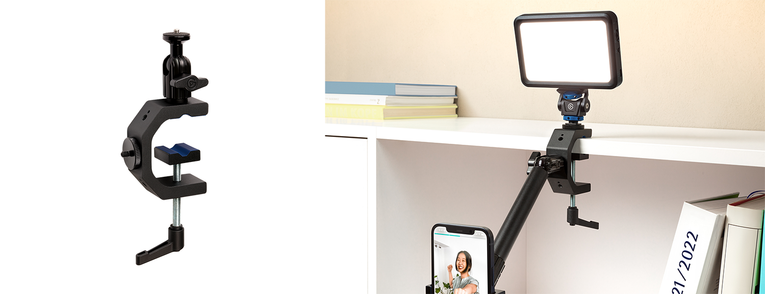 ボールヘッドと4つの1/4インチねじホールを備えた頑丈なGクランプ「Heavy Clamp」は、あらゆる場所にギアをマウントできます。デスクや棚、柱など、さまざまな形状のものに対応します。どんな環境でも完璧な照明アングル、マイク位置、オーバーヘッド撮影を可能にします。