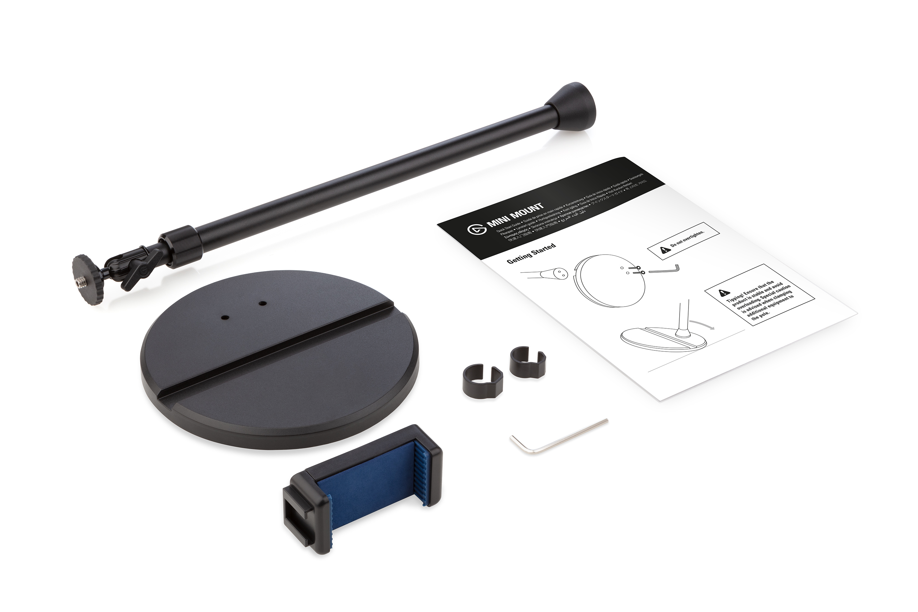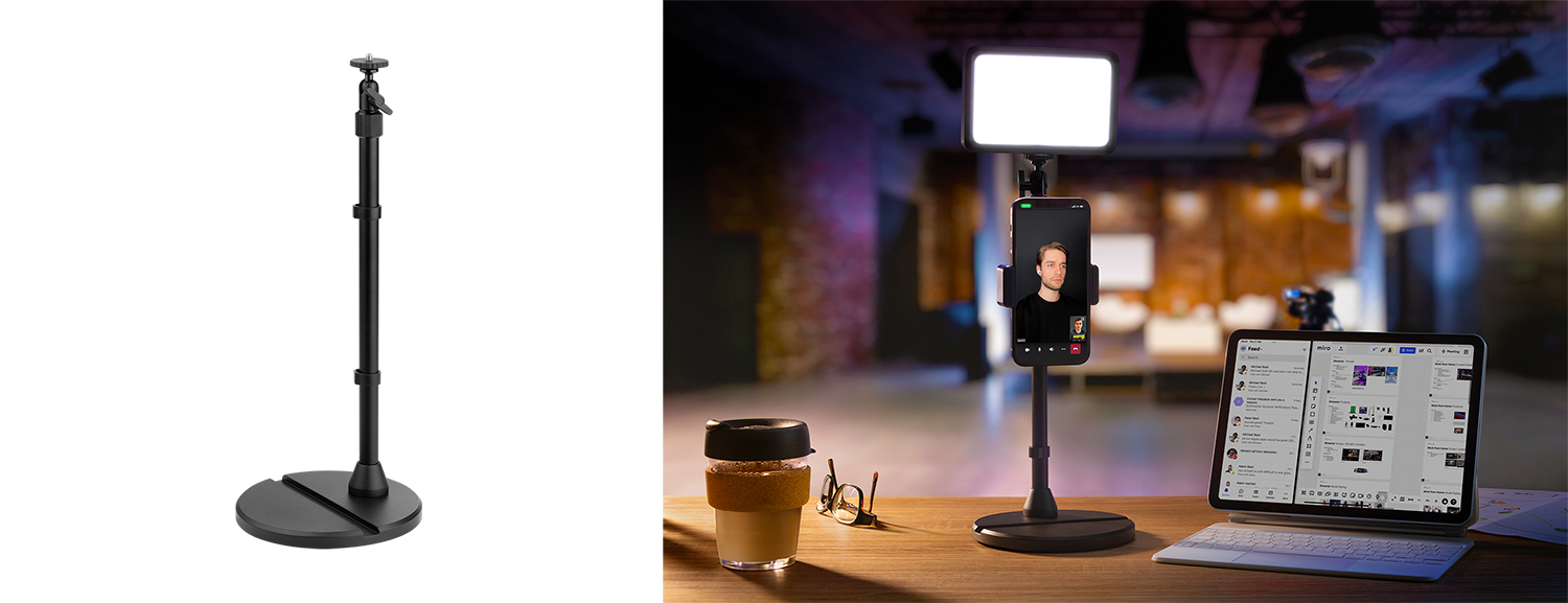 多様なデバイスに対応する小型のリグ「Mini Mount」は、最小限のスペースで効率の良いセットアップを実現します。 回転可能なボールヘッドと1/4インチねじ付きの伸縮式ポールには、カメラや照明器具、マイクをマウントできる他、別売りの「Cold Shoe」を取り付けることが可能。さらに、2つの1/4インチねじを備えた付属のスマホホルダーを使えば、モバイルライブ配信やビデオ通話のセットアップをスマートに設置することが可能です。自立型のサポートベースのおかげで、「Mini Mount」はどこにでも移動することができます。 また、デバイススロットにタブレットを立てかければ、メモを見たり、メディアフィードをモニターしたり、ゆったりとビデオを見たりすることも可能です。