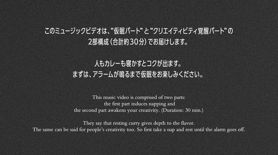 本ミュージックビデオ内で提供する2つのパート含む全体のアニメーション制作・企画開発を、様々なミュージックビデオや教育番組映像を担当してきた高橋まりな氏(DRAWING AND MANUAL所属)に監督いただきました。また、ミュージックビデオ全体の映像テーマには「寝かせることでコクが出て、起きる(食べる)と刺激を与えてくれる」ものとして、日本の食文化の1つでもある「カレー」を採用しました。カレー同様にこのビデオを通して寝て、起きていただくことでコク(クリエイティビティ)を感じていただければと思います。