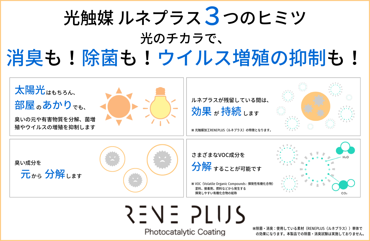 除菌・消臭効果が高く、さらに電力も使わないエコロジーなルネプラスは、太陽や室内の「光」によって効果を発揮します