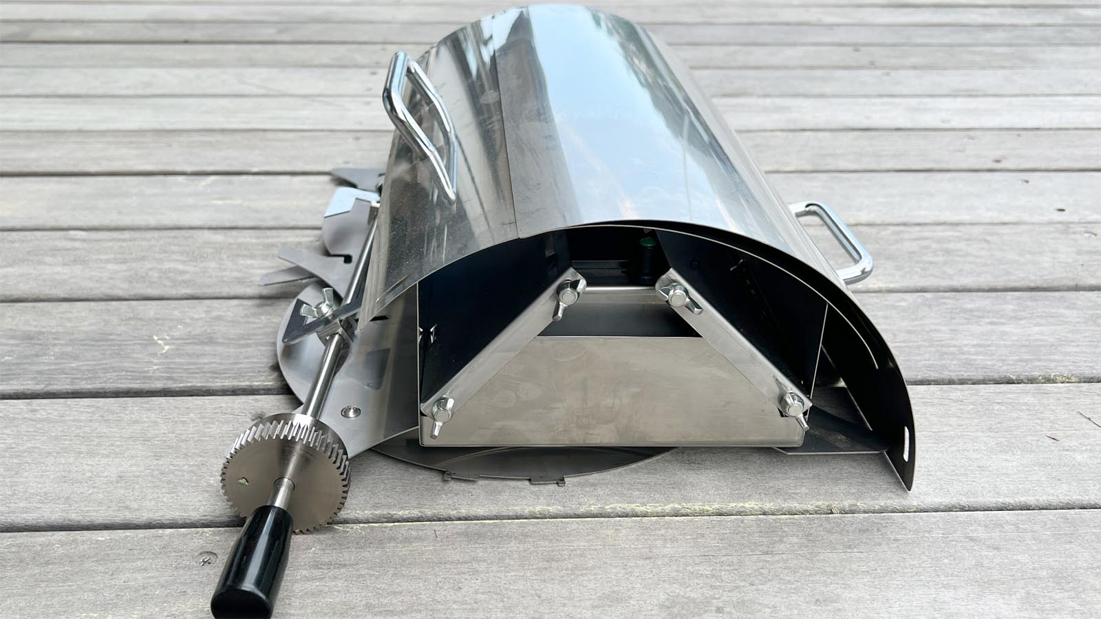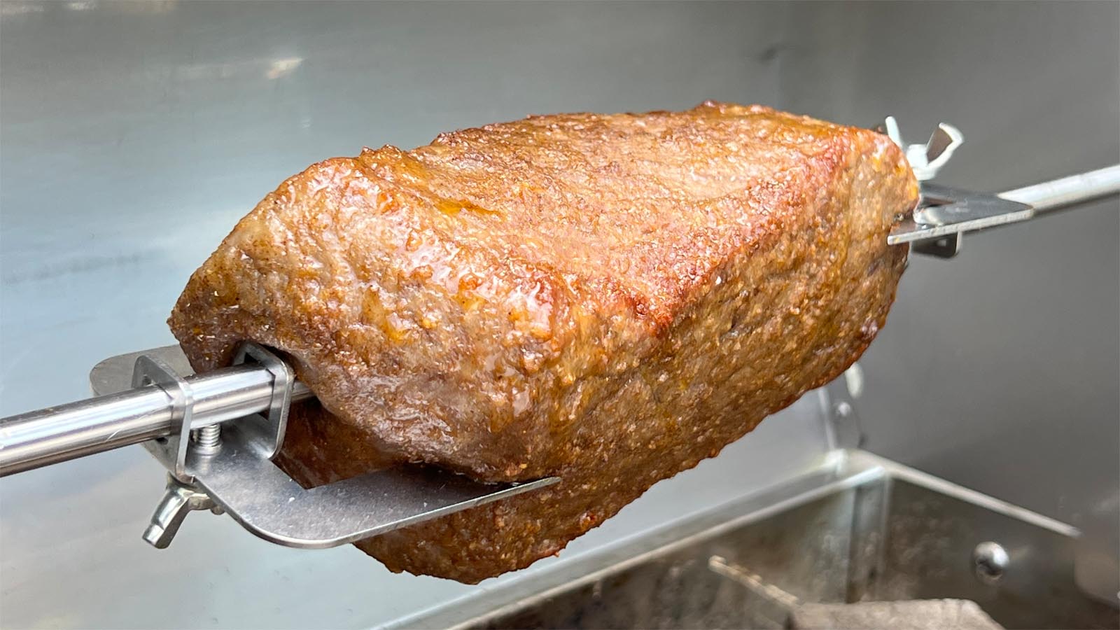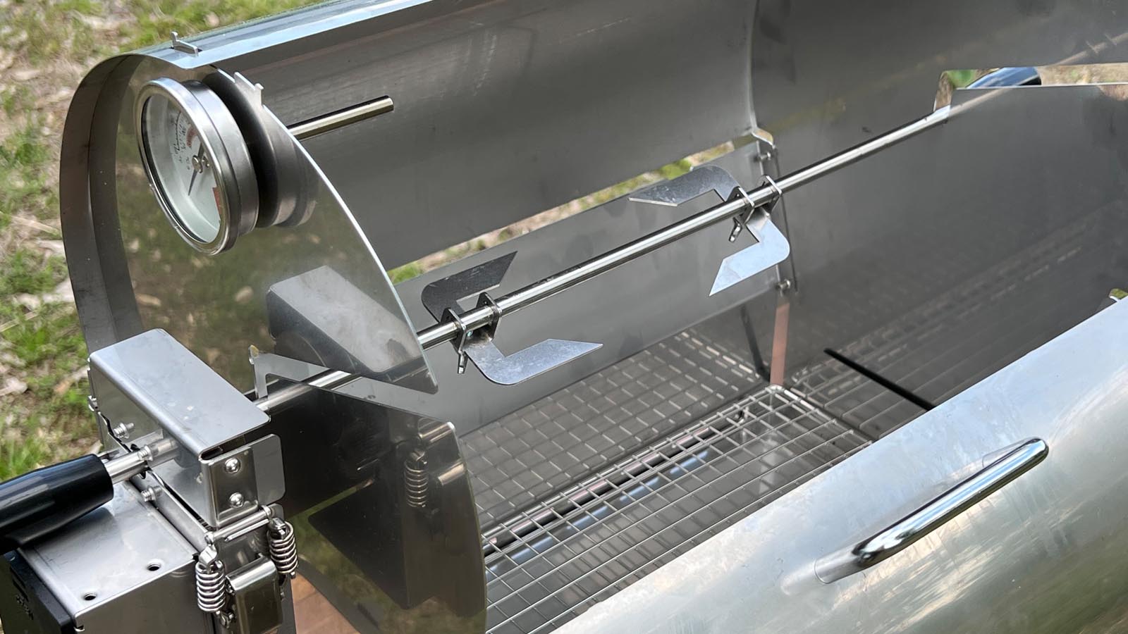 モーターの力で軸が360°回転する、蓋付きの炭焼きオーブングリルです。